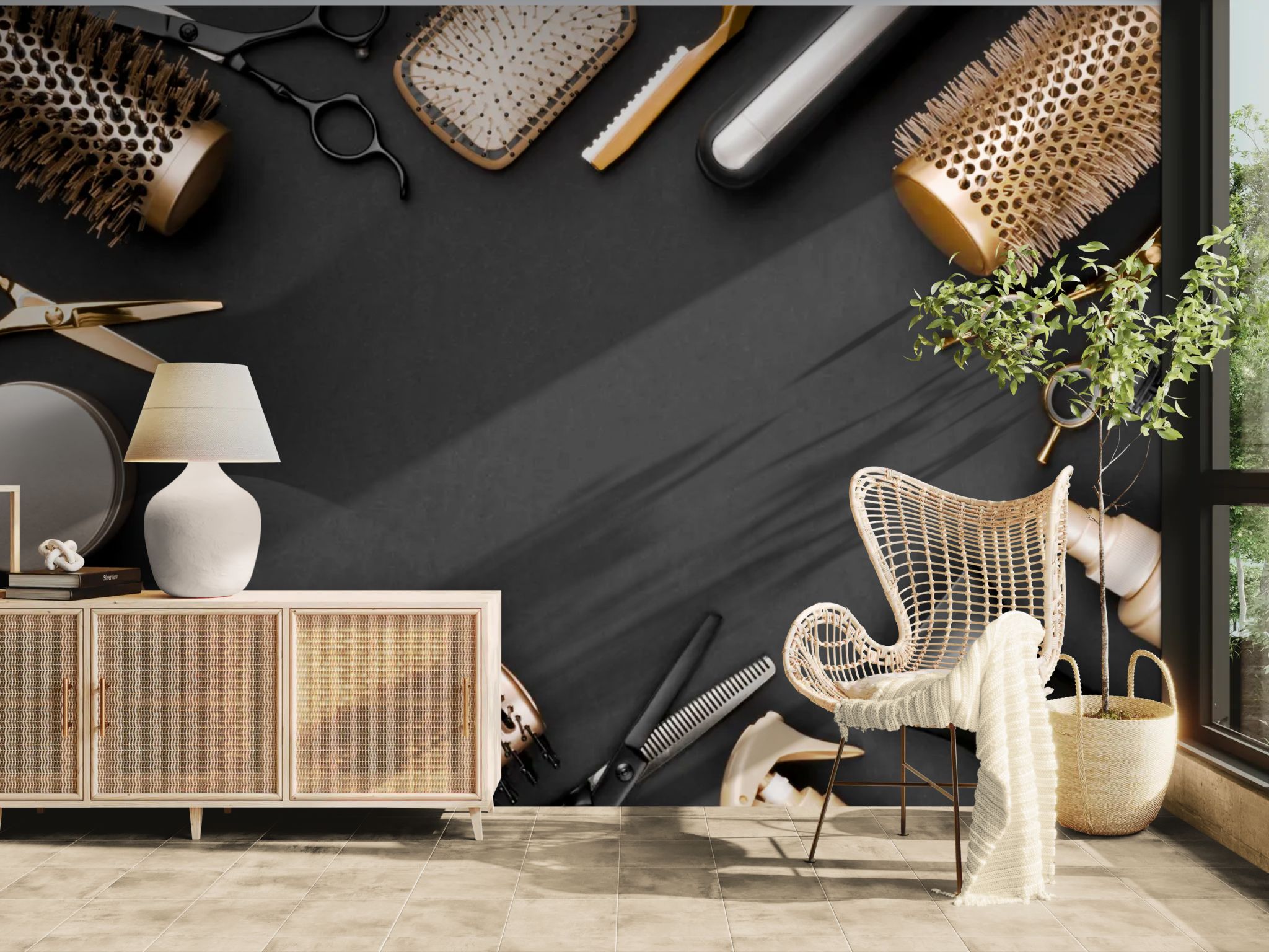 The elegance of the craft. Enhance your hair salon or barbershop with this professional wallpaper . The artistic depiction of hairdressing tools (scissors, combs, razors), often in black and white or metal, showcases your expertise with style. This themed design creates a strong and chic visual identity, transforming your workspace into a stylish and welcoming environment.