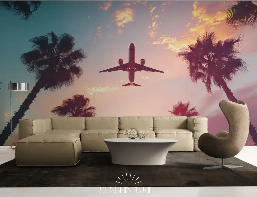 Escape to an exotic, vintage destination with this retro wallpaper featuring a vintage airplane flying over majestic palm trees. Its soft, warm tones create a chic, relaxed, and subtly nostalgic ambiance. Perfect for a living room, bedroom, or office, this design brings charm, elegance, and a spirit of adventure to your interior every day. Its exceptional quality guarantees a realistic, durable, and refined finish.