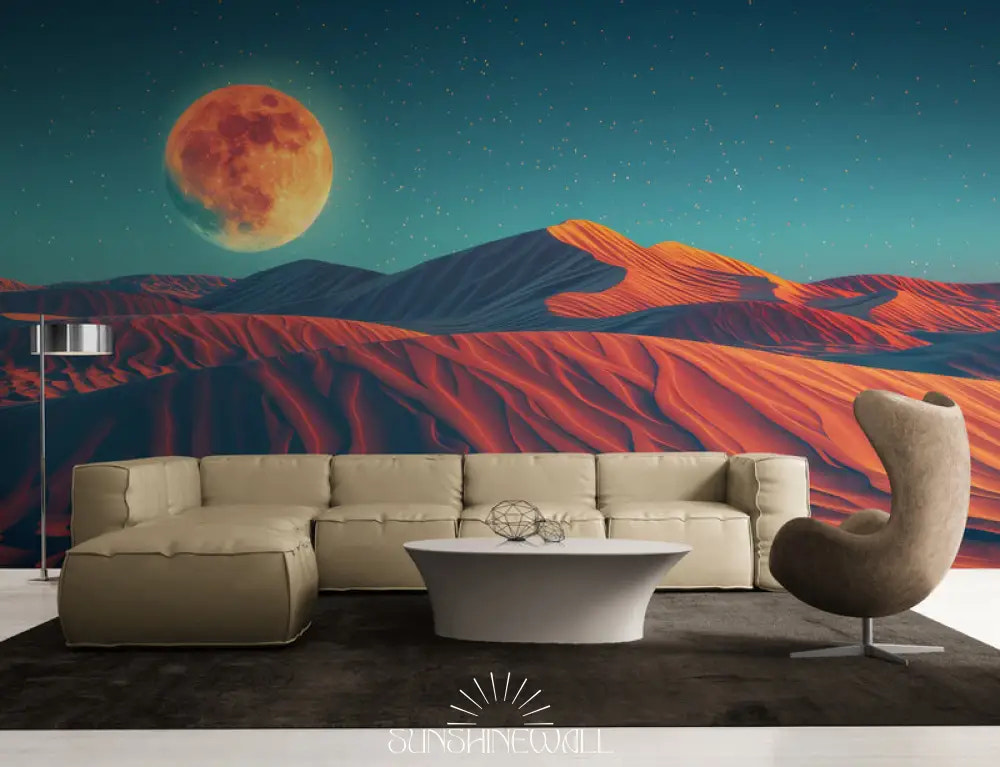 Immerse your home in a mysterious and elegant atmosphere with this retro wallpaper depicting delicate dunes under a bright moon. Its soft shades and harmonious shapes create a refined, peaceful, and subtly exotic ambiance. Ideal for a cozy bedroom or living room, this decor invites daily contemplation and dreaming. Its premium quality ensures a precise, durable, and chic finish. A perfect decoration for an elegant, soothing, and delicately retro atmosphere.
