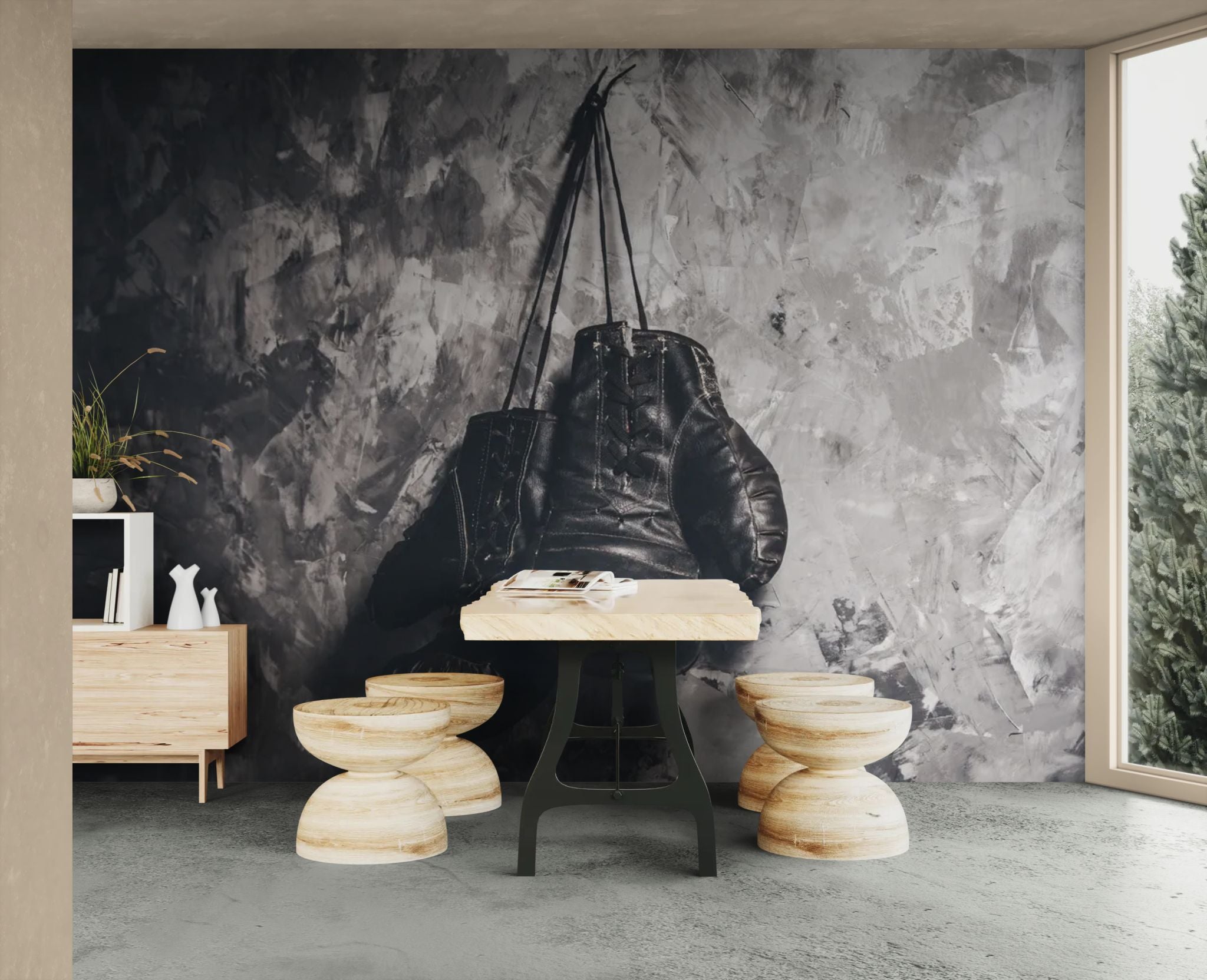 The noble spirit of the boxing ring of yesteryear. Embrace retro-sport style with this sports wallpaper . The pair of vintage boxing gloves in patinated leather, whether hung or placed on a surface, evokes old-school training and determination. This masculine and textured design adds character. Ideal for a home gym, office, or teenager's bedroom.