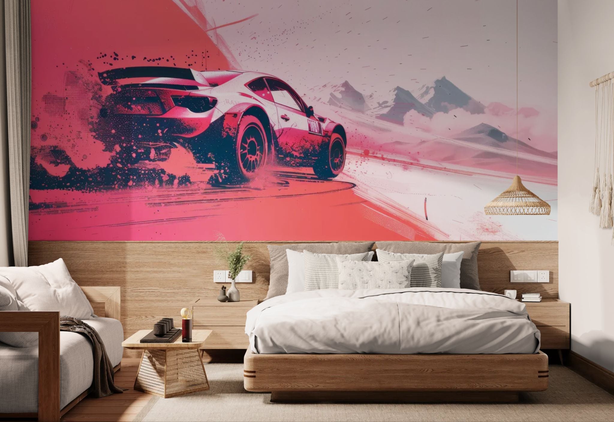 Pure speed. Celebrate mechanical performance with this rally wallpaper . The dynamic shot of the car in action, kicking up dust, emphasizes power and speed. This immersive design transforms the room into a VIP paddock, bringing undeniable kinetic energy. The perfect choice for a games room, a converted garage, or the bedroom of a motorsport fan.