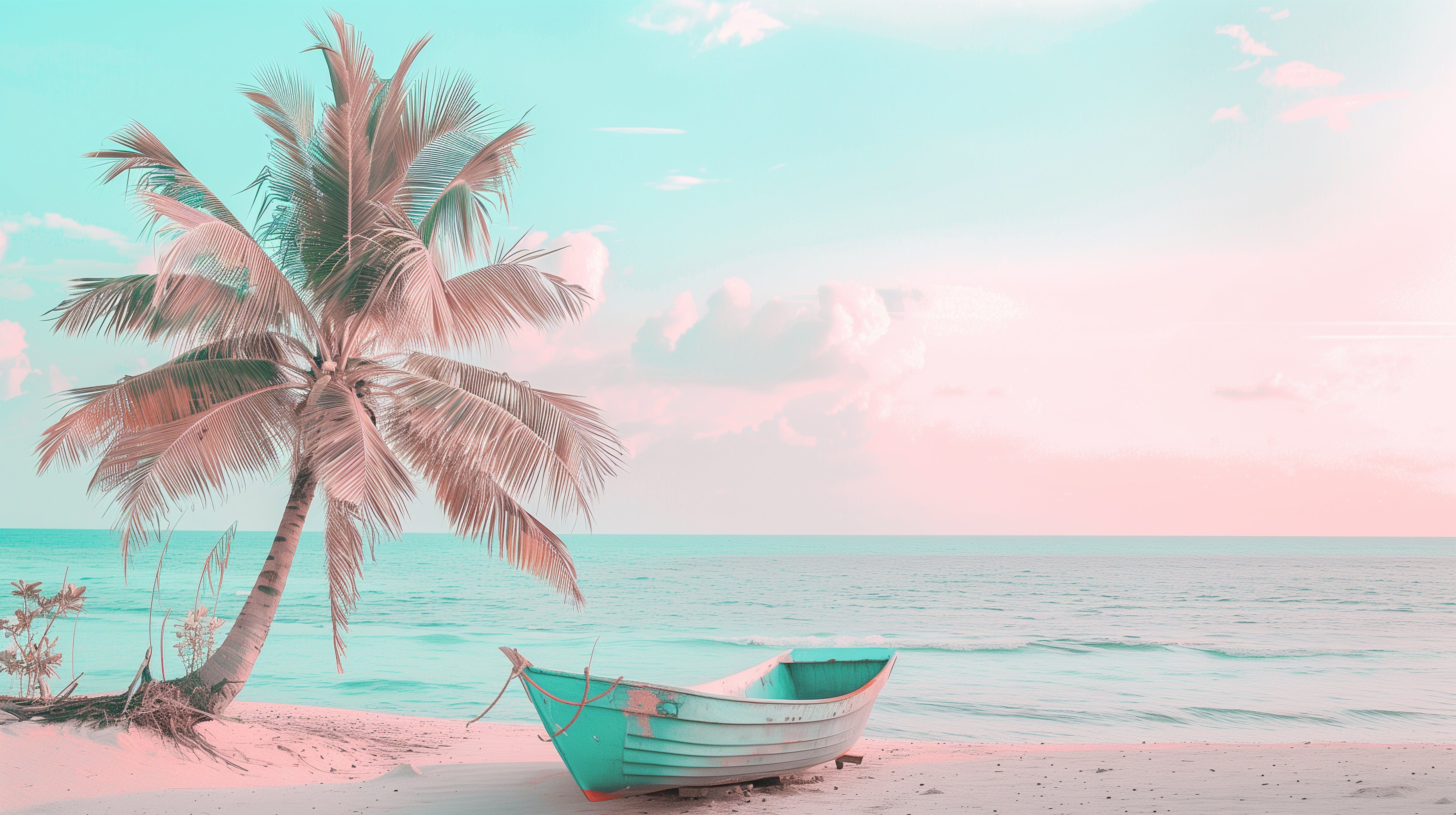 Escape in style, Robinson Crusoe style. Invite gentle adventure with this tropical wallpaper . The image of a solitary boat beached near a palm tree on a deserted shore evokes absolute calm and exoticism. The turquoise water and green vegetation bring freshness and a change of scenery. Perfect for a bathroom or bedroom, creating an oasis of tranquility far from the urban bustle.