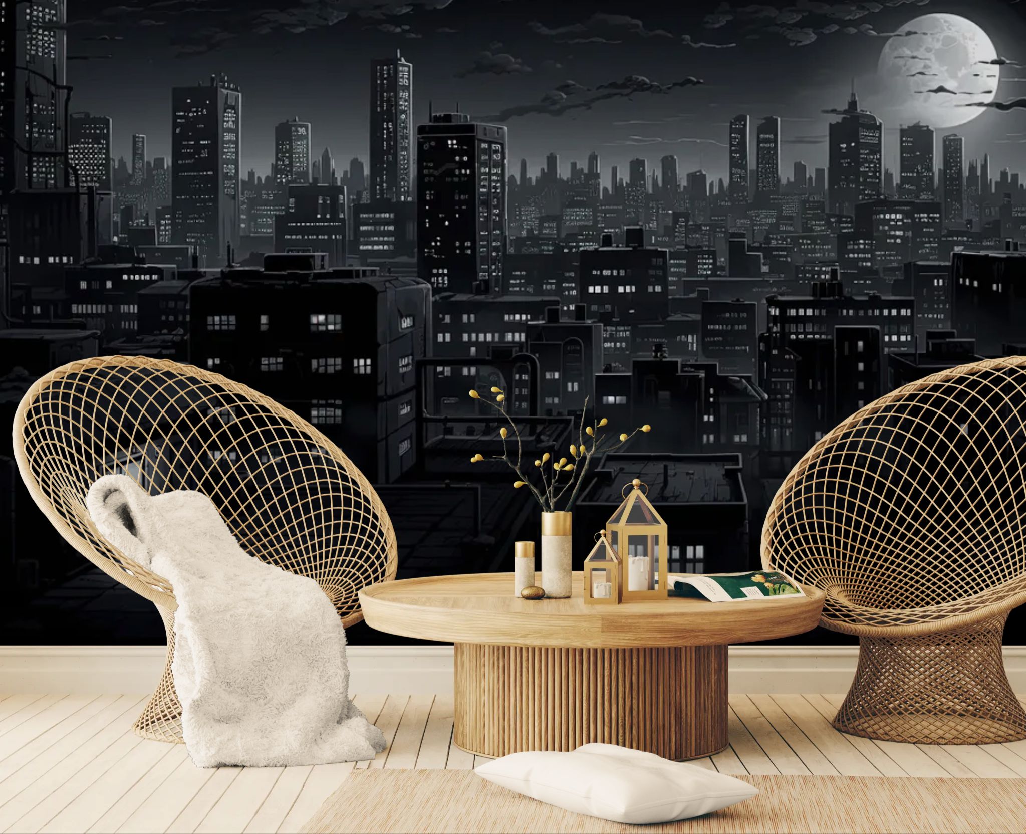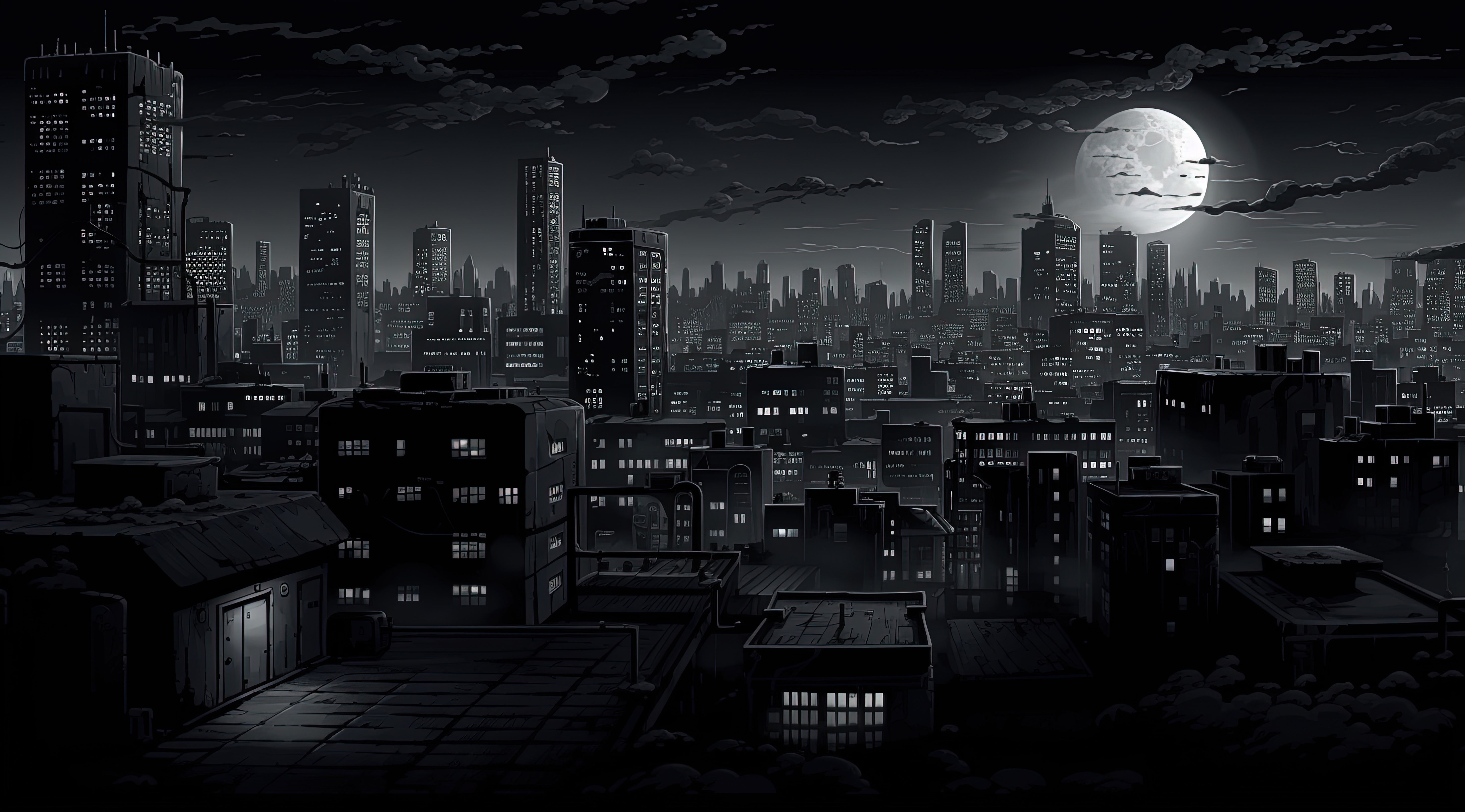 The silent glow of a sleeping metropolis. Embrace a modern style with this urban wallpaper . The skyline of a nighttime city illuminated by a vast moon creates a striking contrast between human architecture and celestial nature. The dark, bluish hues lend a chic and sophisticated atmosphere. Perfect for a contemporary living room or a teenager's bedroom.