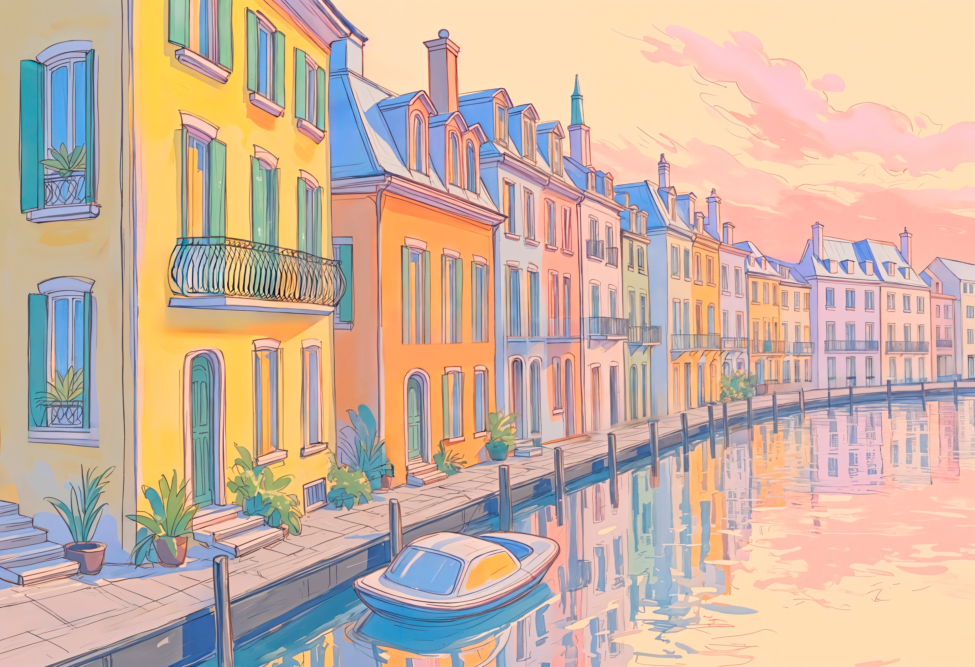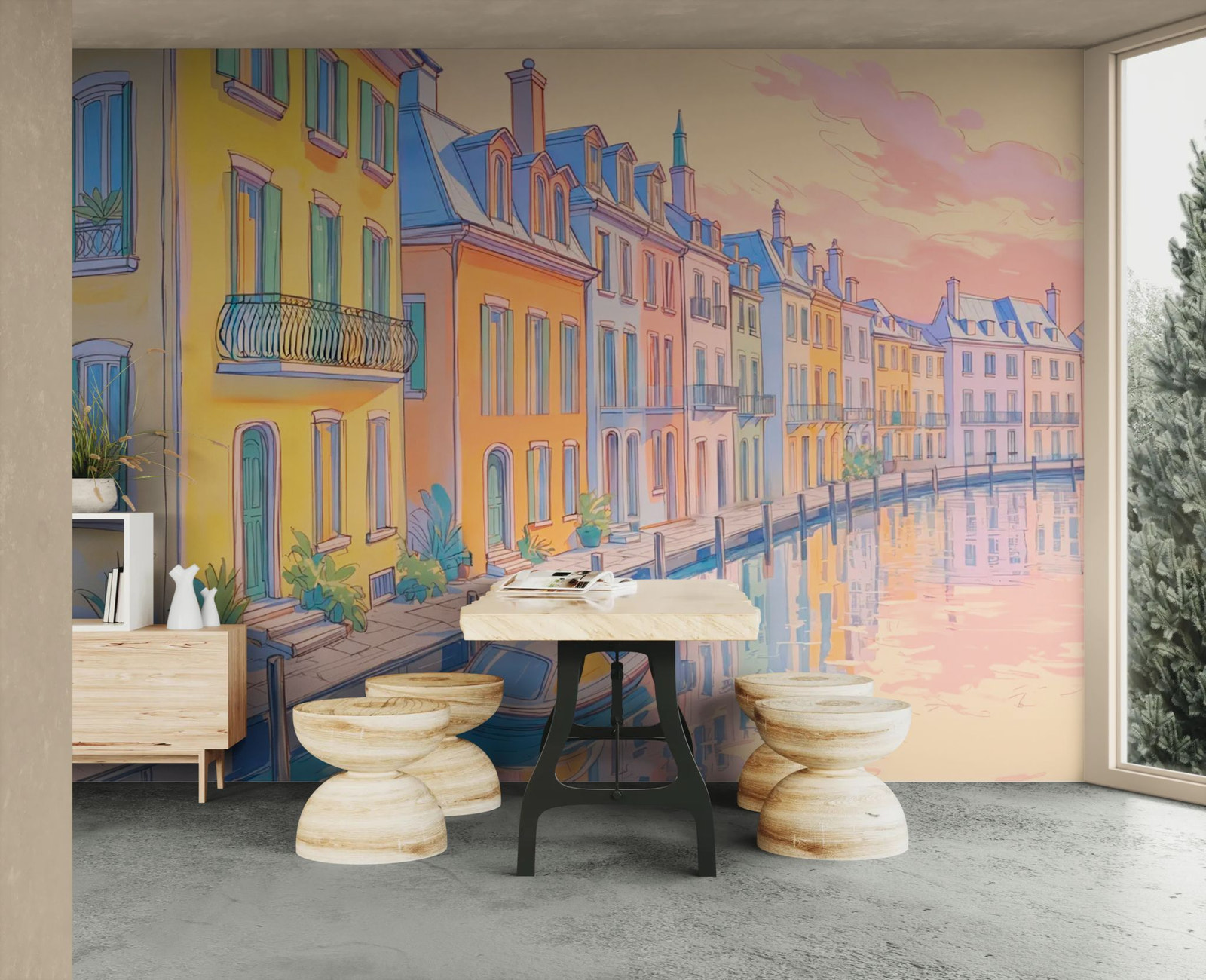 The joie de vivre of waterfront cities. Travel to Venice or Amsterdam with this city wallpaper . The European canal, lined with colorful houses reflected in the water, creates a picturesque and cheerful atmosphere. This architectural trompe-l'œil visually expands the space and adds a touch of joy. Ideal for a kitchen or a welcoming entryway.