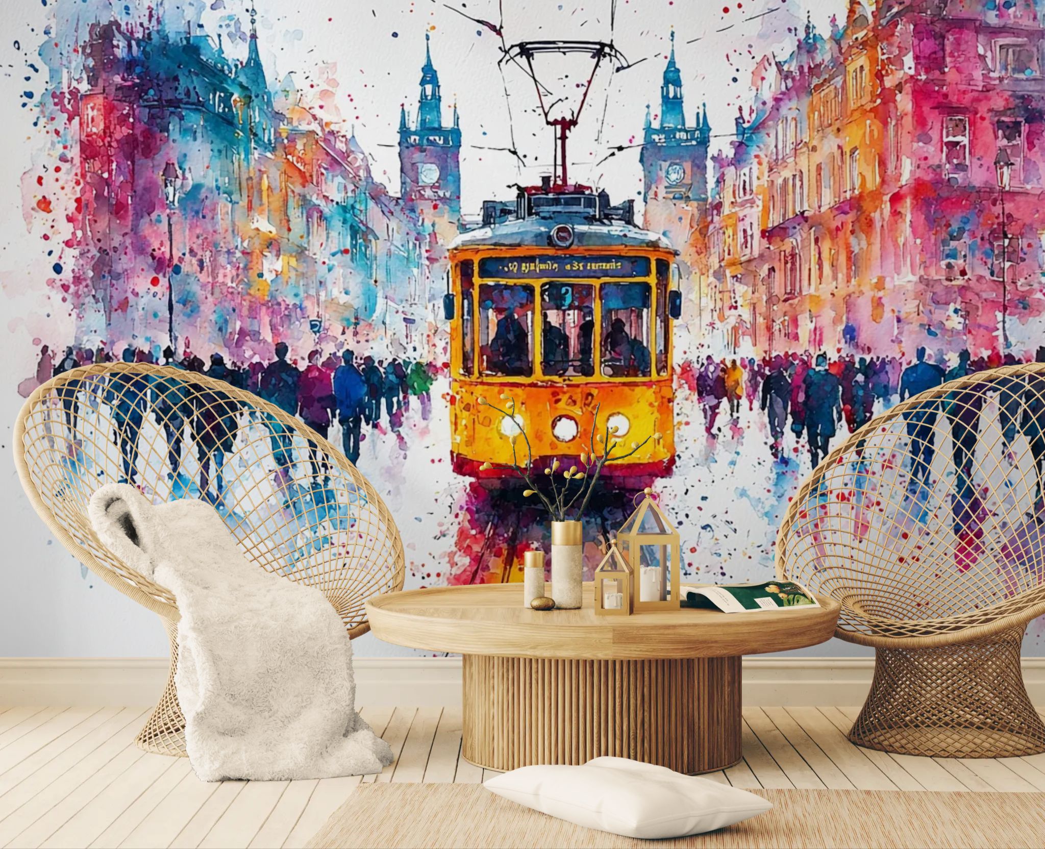 Urban energy in vibrant colors. Energize your interior with this unique city wallpaper . The depiction of a tram crossing a street, rendered with a colorful artistic touch, captures the movement and life of the city. The vibrant hues and painterly style bring a joyful modernity. Ideal for a contemporary living room or a creative office.