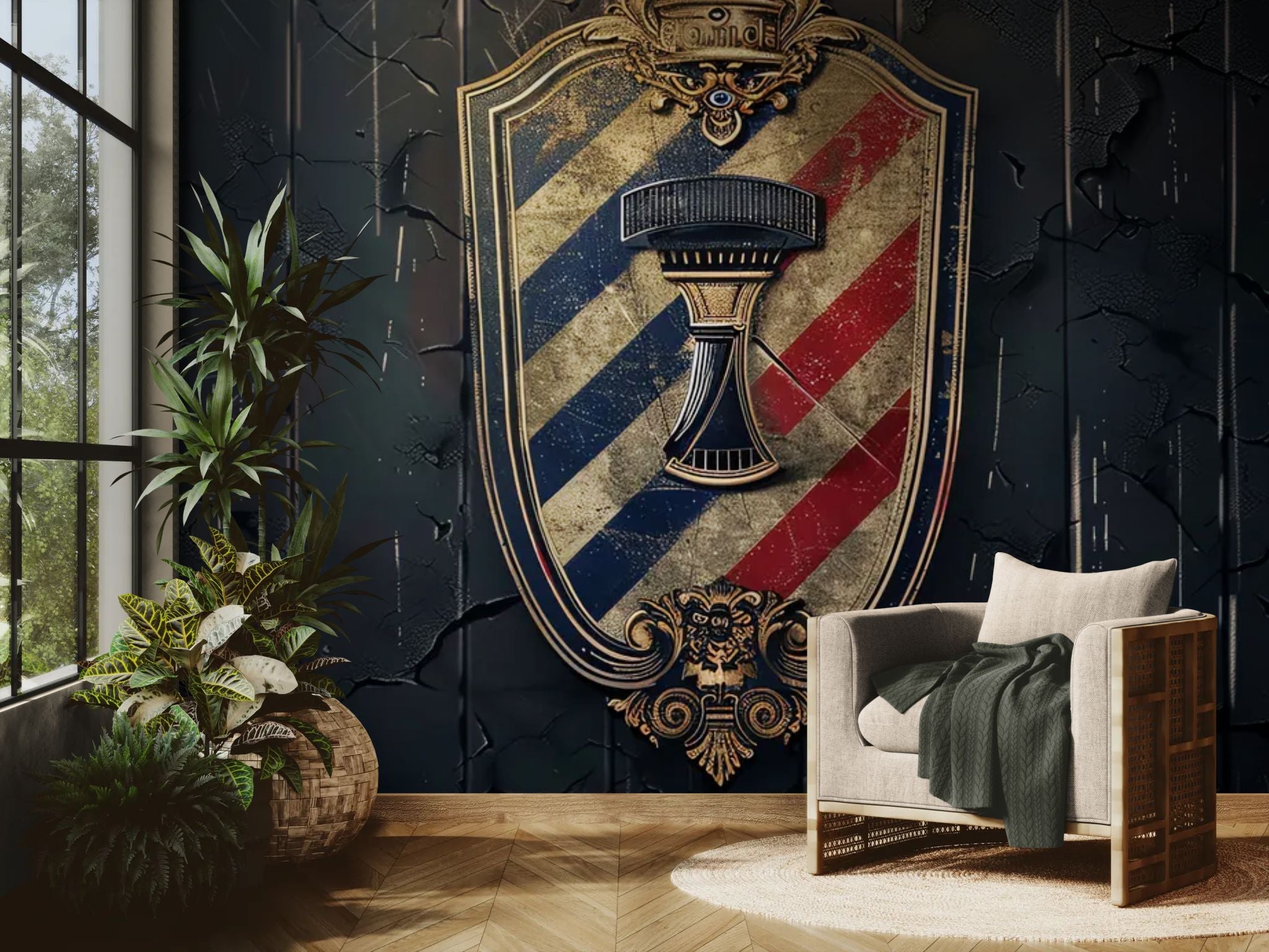 The authenticity of gentleman style. Emphasize the masculine and refined character of your décor with this vintage wallpaper . The detailed illustration of a retro barber emblem , with its antique typography and Victorian embellishments, evokes the elegance of salons of yesteryear. This black and white design adds a chic and timeless graphic touch. Ideal for an industrial-style living room, a men's dressing room, or for adding character to a traditional barbershop.