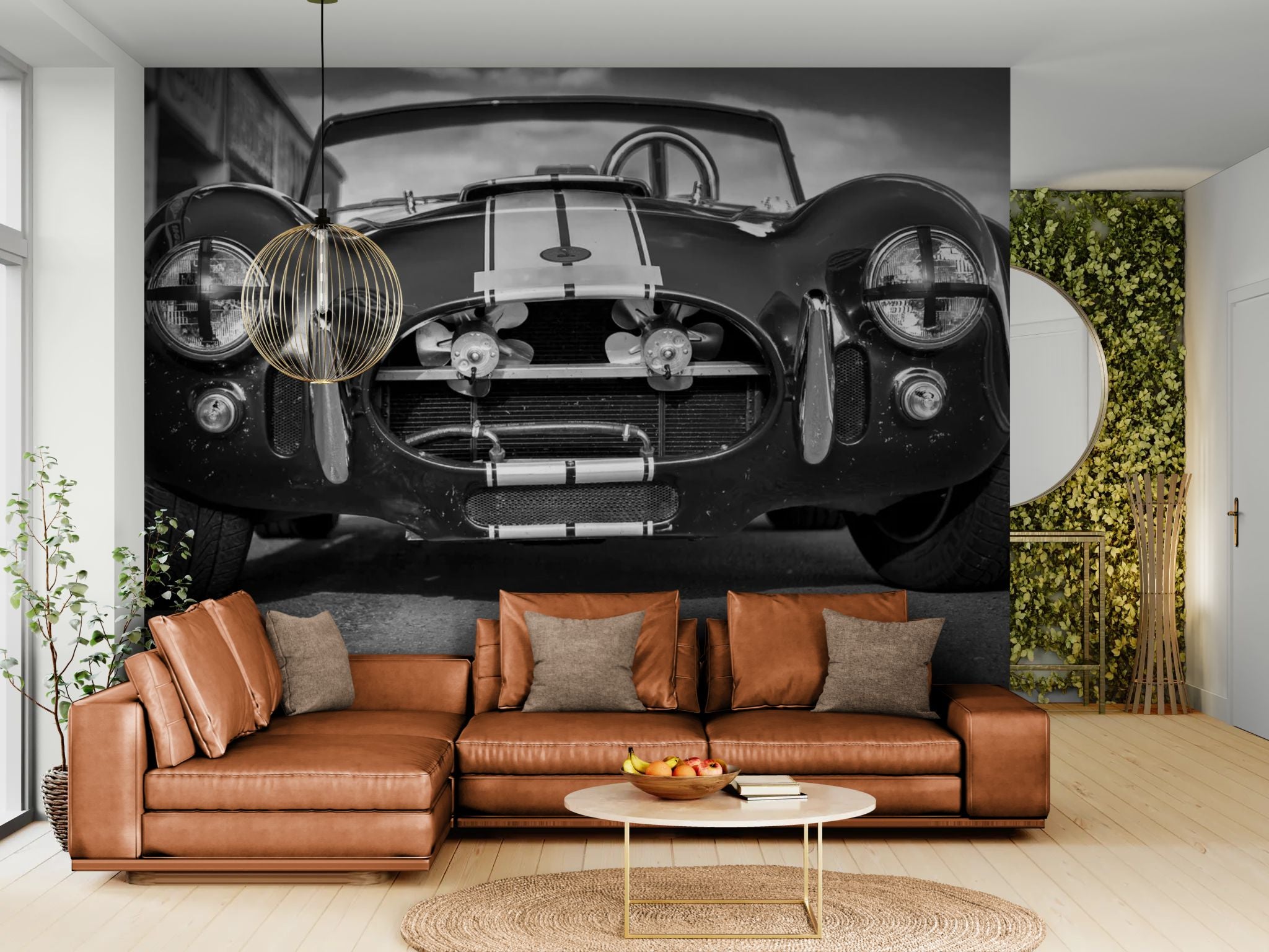The timeless elegance of mechanics. Bring a touch of masculine sophistication to your interior with this vintage black and white wallpaper . The photograph of an iconic sports roadster captures the beauty of chrome curves and the spirit of freedom from the golden age of motoring. This monochrome design offers a chic and powerful contrast, ideal for an office, a luxury garage, or a living room with a refined industrial style. An ode to speed and classic design.
