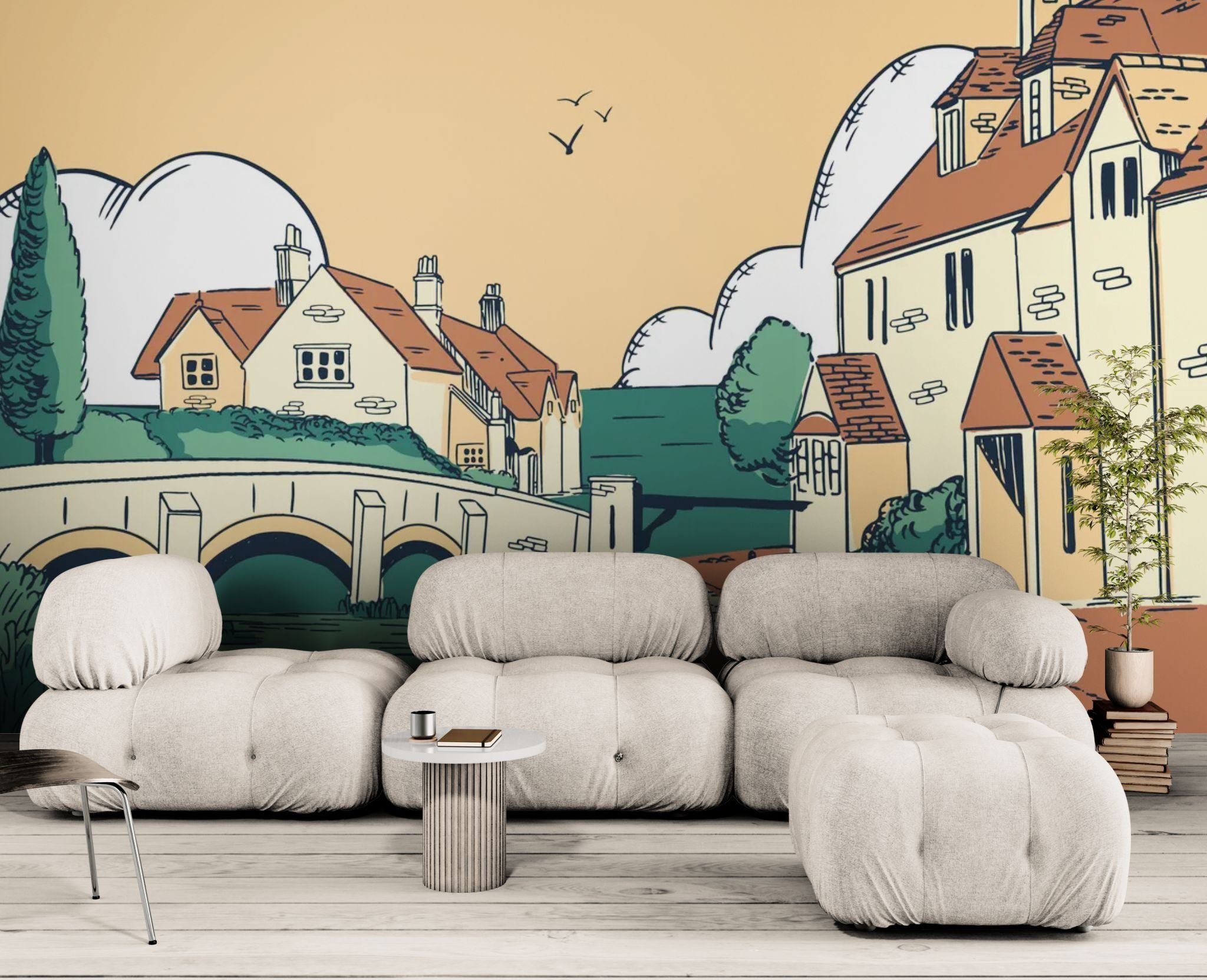 Bucolic charm and vintage nostalgia. Let yourself be charmed by this retro wallpaper . The illustration of an old village and its stone bridge evokes the gentle pace of life of yesteryear. This narrative design brings soul and authentic warmth to a chic country kitchen or a welcoming entryway. A touch of timeless poetry for lovers of picturesque settings and visual stories.