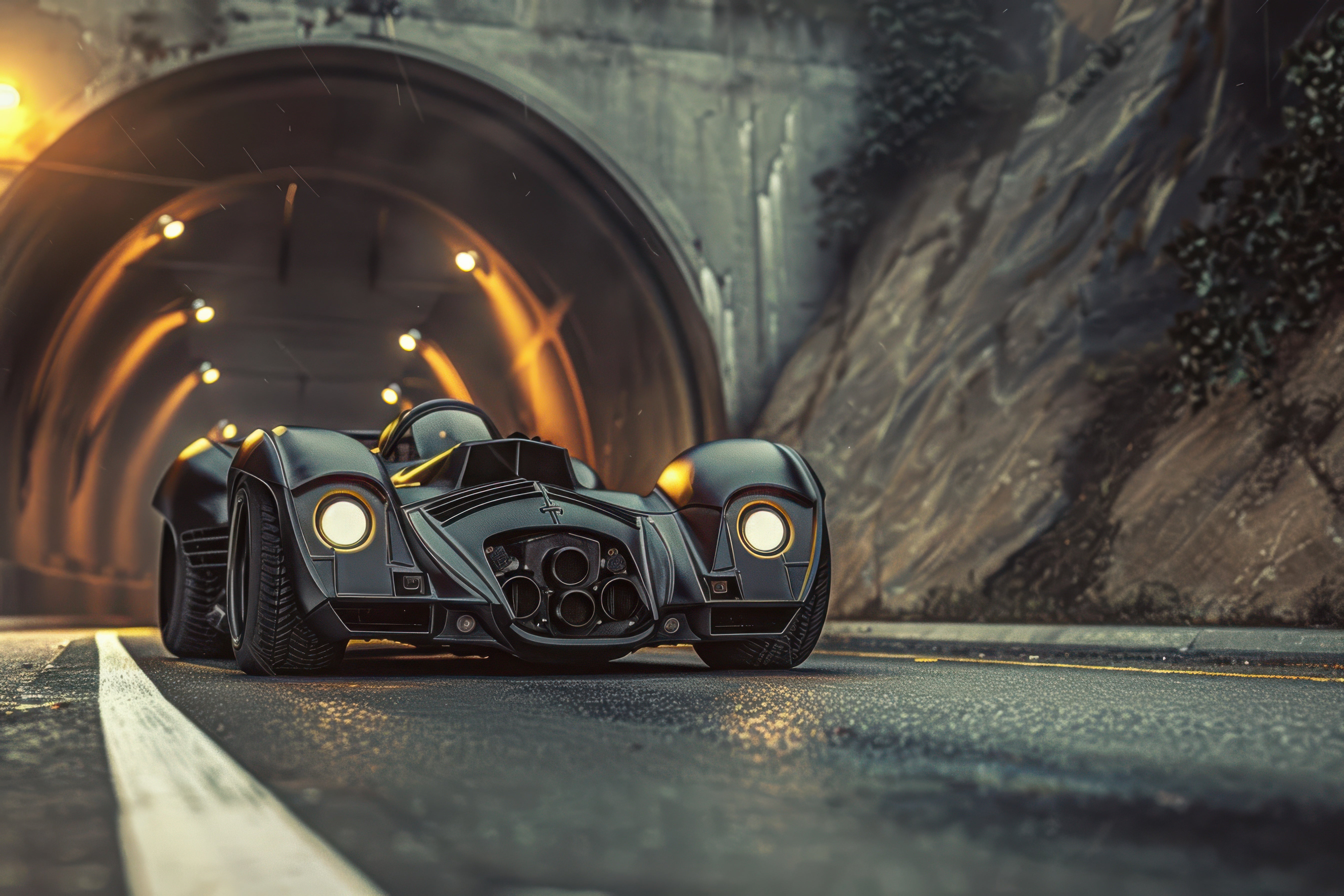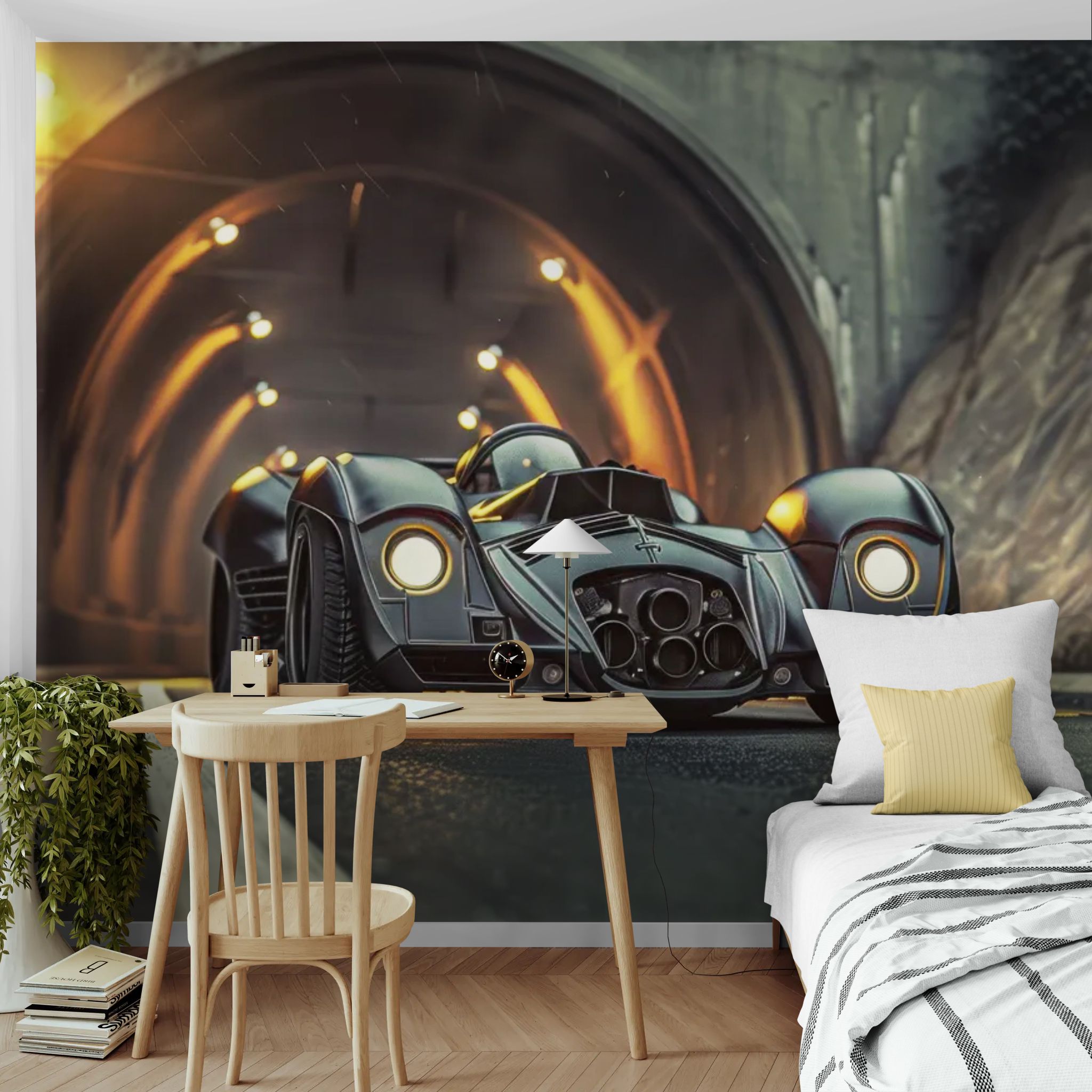Une supercar fuselle à travers un tunnel baigné de lumières futuristes, contrastant reflets métalliques et vitesse pure. Le décor dégage puissance, adrénaline et élégance, idéal pour un garage aménagé, un bureau créatif ou une salle gaming. Parfait pour les passionnés d’automobile qui veulent un intérieur audacieux et résolument moderne.