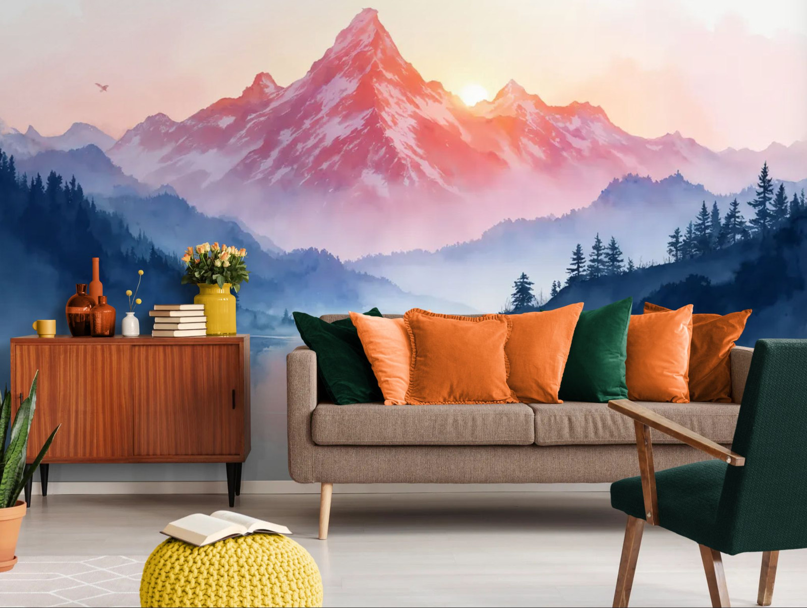 Une montagne rose enveloppée de brume se dessine dans un esprit aquarellé délicat. Les dégradés subtils apportent poésie et légèreté. Parfait pour instaurer une ambiance douce et artistique. Le décor diffuse une sérénité naturelle. Une création murale pleine de sensibilité.