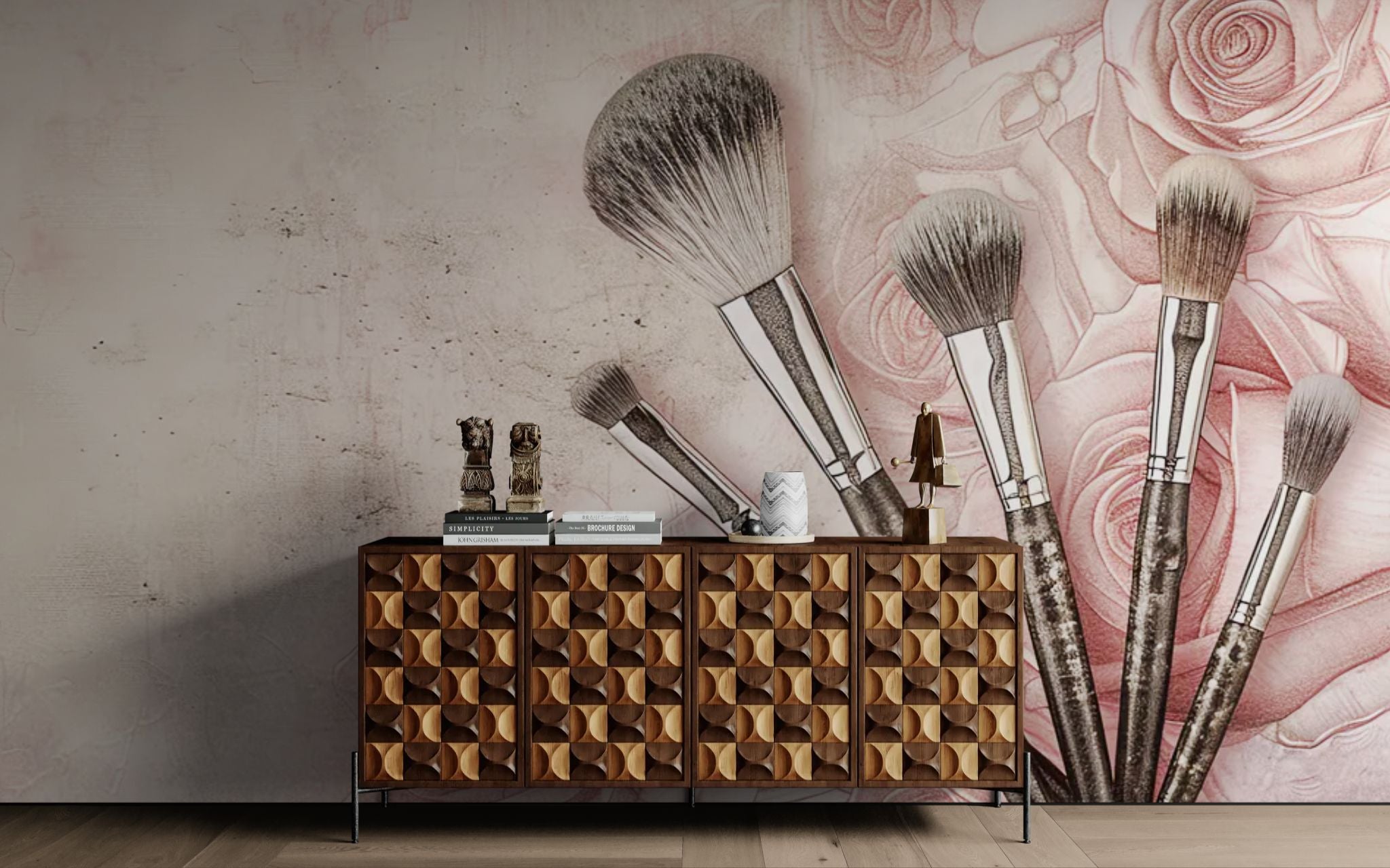 L'élégance florale au service de l'art. Associez nature et créativité avec ce papier peint esthétique. Le mariage de pinceaux d'art et de roses épanouies offre un contraste saisissant entre la rigueur de l'outil et la délicatesse de la fleur. Ce décor sophistiqué, aux couleurs tendres, est parfait pour inspirer la créativité dans un bureau ou apporter une touche féminine et cultivée à un dressing.