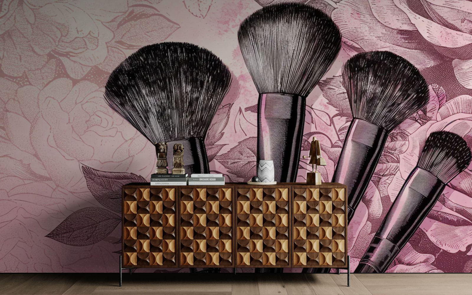 L'univers glamour du maquillage pro. Célébrez la féminité avec ce papier peint beauté. La mise en scène élégante de pinceaux de maquillage sur un fond rose poudré crée une ambiance chic et "girly". Ce décor est parfait pour aménager un coin coiffeuse, un dressing ou décorer un institut de beauté. Il apporte une touche de sophistication douce et un clin d'œil à l'art de prendre soin de soi.