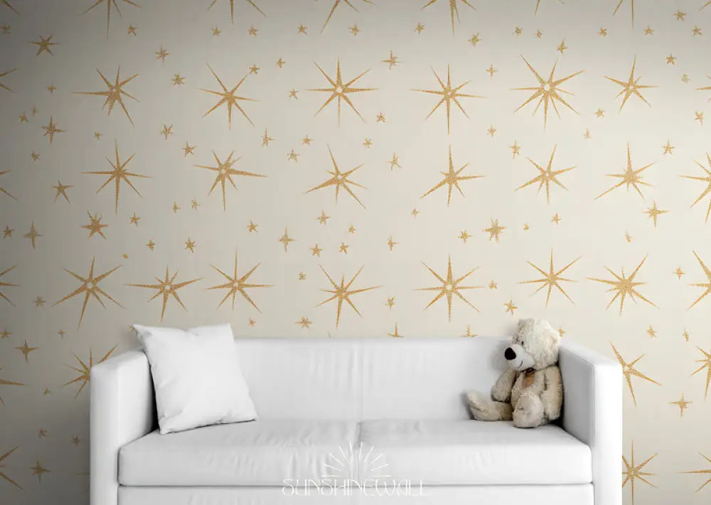 Fondez pour la fantaisie cosmique du «Papier Peint Enfant – Motifs Géométriques Étoilés». Les triangles, cercles ou chevrons se conjuguent à des étoiles, en filigrane ou plus marquées, créant un décor à la fois créatif et onirique. L’impression soignée souligne la netteté des formes, offrant un résultat moderne et stimulant. Une décoration parfaite pour initier l’enfant aux formes et au mystère du ciel.