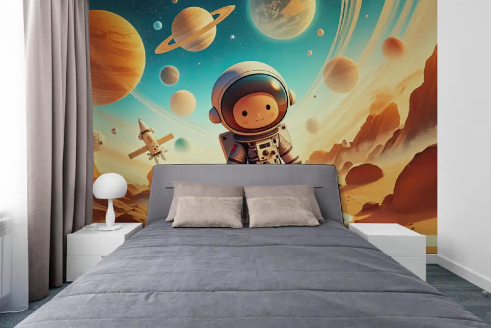 Osez un style scandinave fantaisiste où un astronaute évolue au milieu de planètes stylisées. Ce décor sobre, porté par des tons doux, marie la délicatesse nordique à l’émerveillement spatial. Une invitation à la rêverie scientifique, soulignée par une qualité d’impression irréprochable.