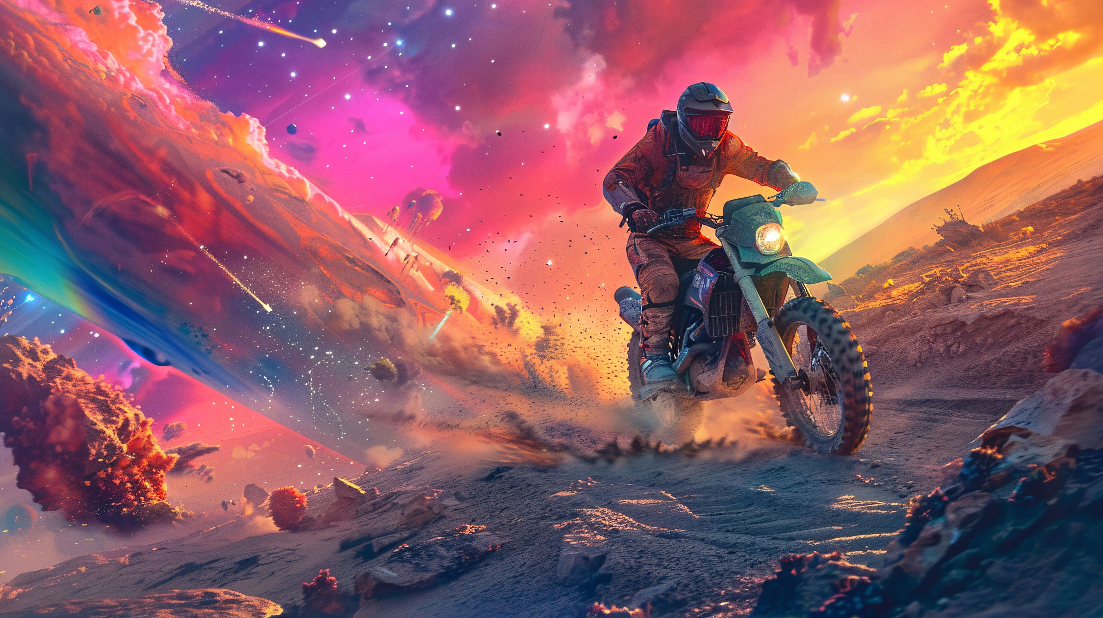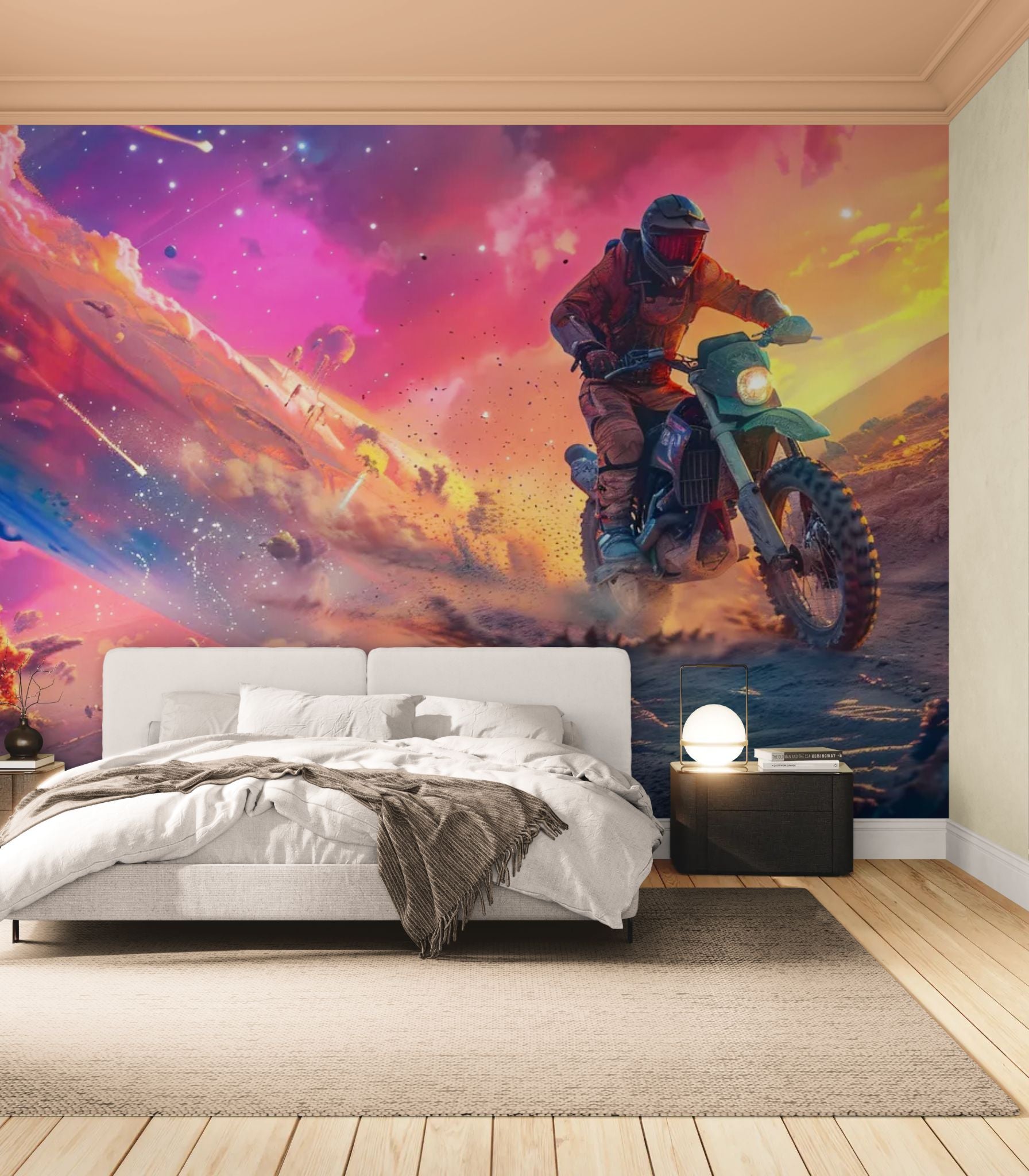 Un pilote légendaire traverse une tempête stellaire aux couleurs spectaculaires, porté par les vents cosmiques. Un univers mural puissant et hypnotique, parfait pour un salon futuriste, une chambre inspirée des étoiles ou un studio créatif.