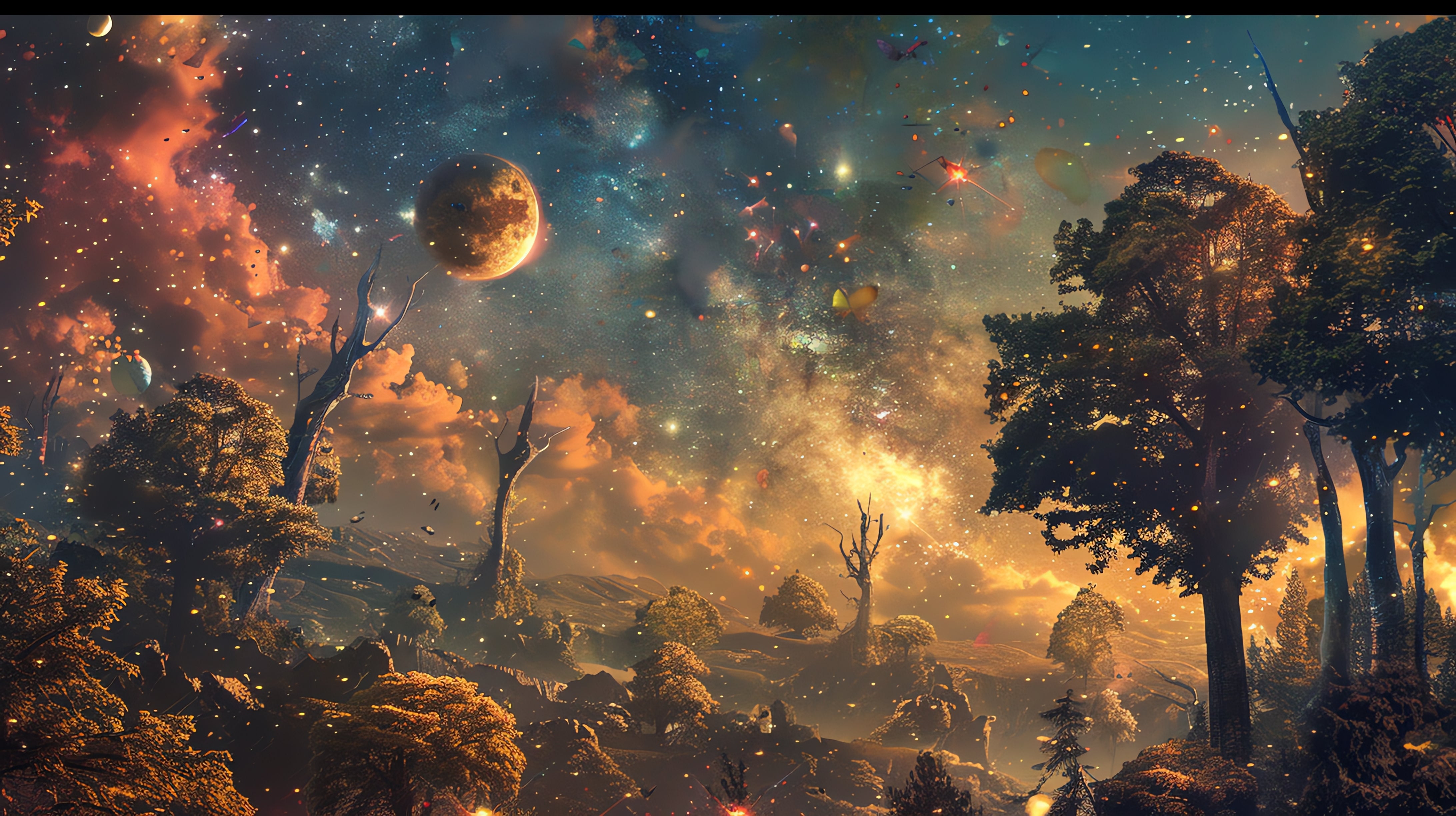 Quand la nature rencontre le cosmos. Osez la poésie absolue avec ce papier peint onirique. La fusion d'une forêt dense et d'un ciel rempli d'astres lumineux crée un paysage céleste unique. Les arbres semblent raciner dans les étoiles, offrant une perspective vertigineuse et féerique. Ce décor, aux teintes nocturnes et scintillantes, est idéal pour créer un sanctuaire de rêves dans une chambre ou un espace de relaxation.