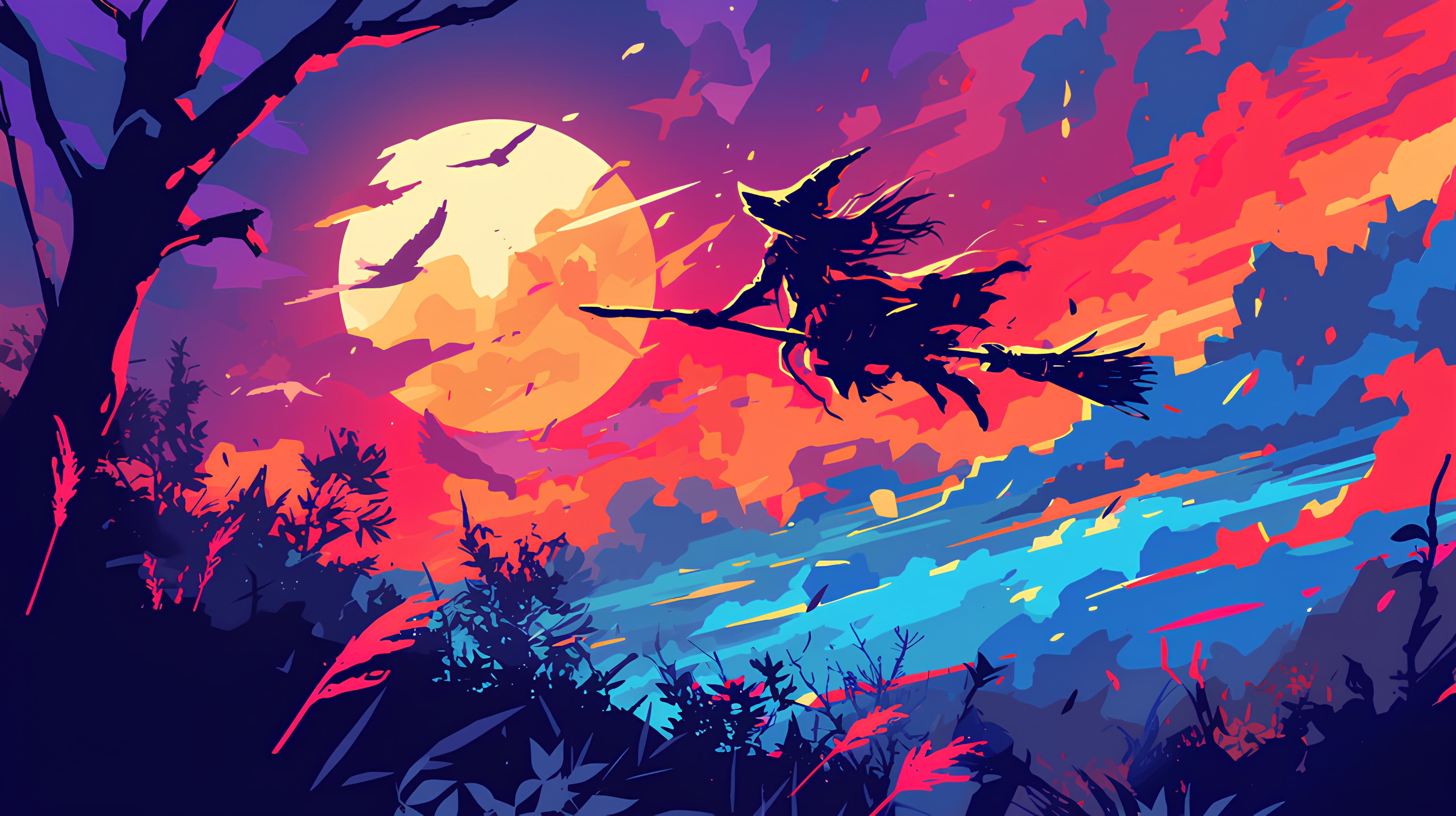 Envolée mystique en couleurs. Osez la fantaisie pop avec ce papier peint illustration. La sorcière volante devant une lune colorée et texturée apporte une dimension artistique et moderne au thème de la magie. Les nuances vibrantes dynamisent l'espace tout en conservant une aura de mystère. Idéal pour stimuler l'imagination dans une pièce créative ou une salle de jeux originale.