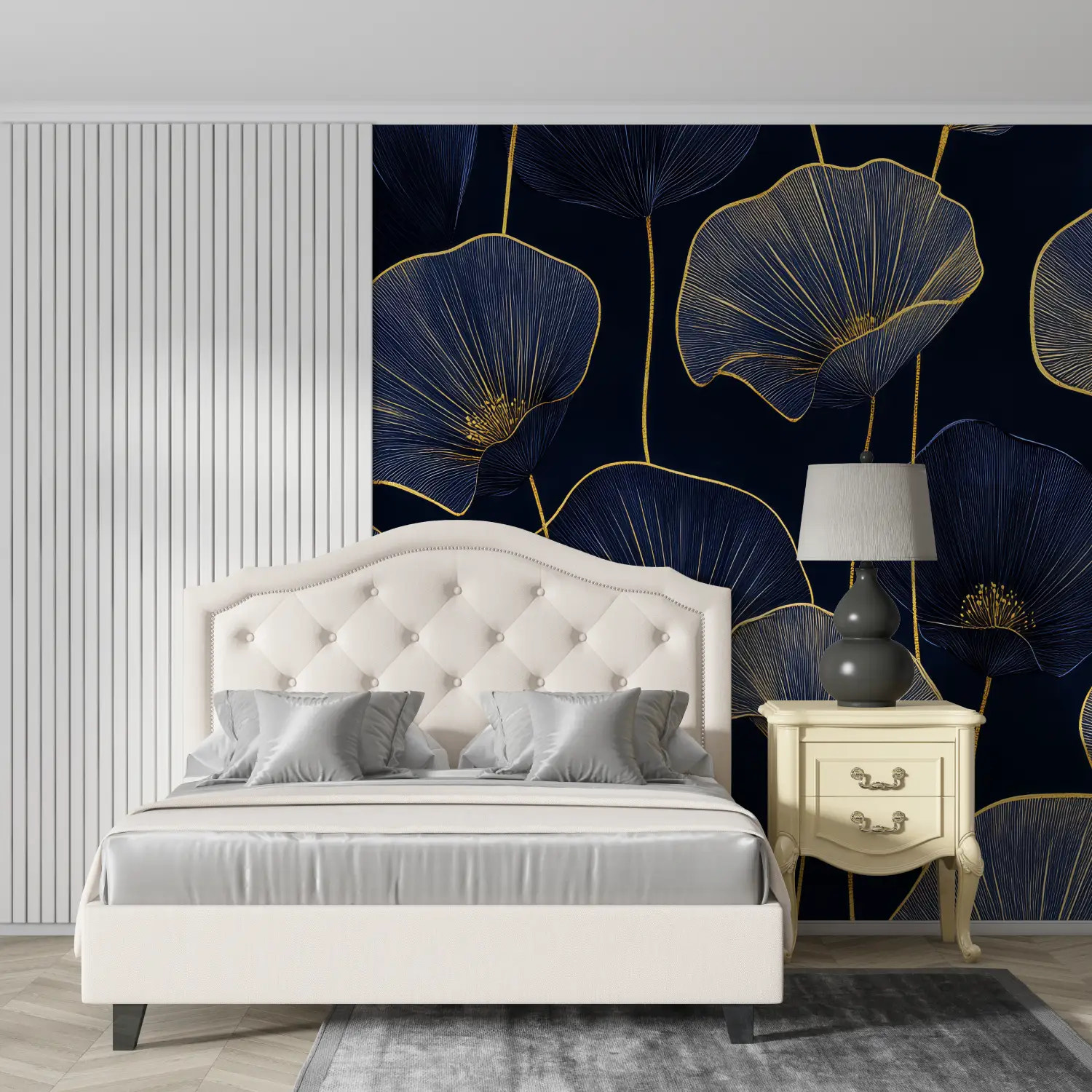 Illuminez votre pièce d’un contraste saisissant où des coquelicots dorés surgissent sur un fond bleu nuit mystérieux. L’éclat métallique des pétales, accentué par une impression soignée, crée un effet luxueux sans jamais tomber dans l’excès. Une ode à la fois au glamour et à la délicatesse florale, idéale pour habiller un mur d’une élégance audacieuse.