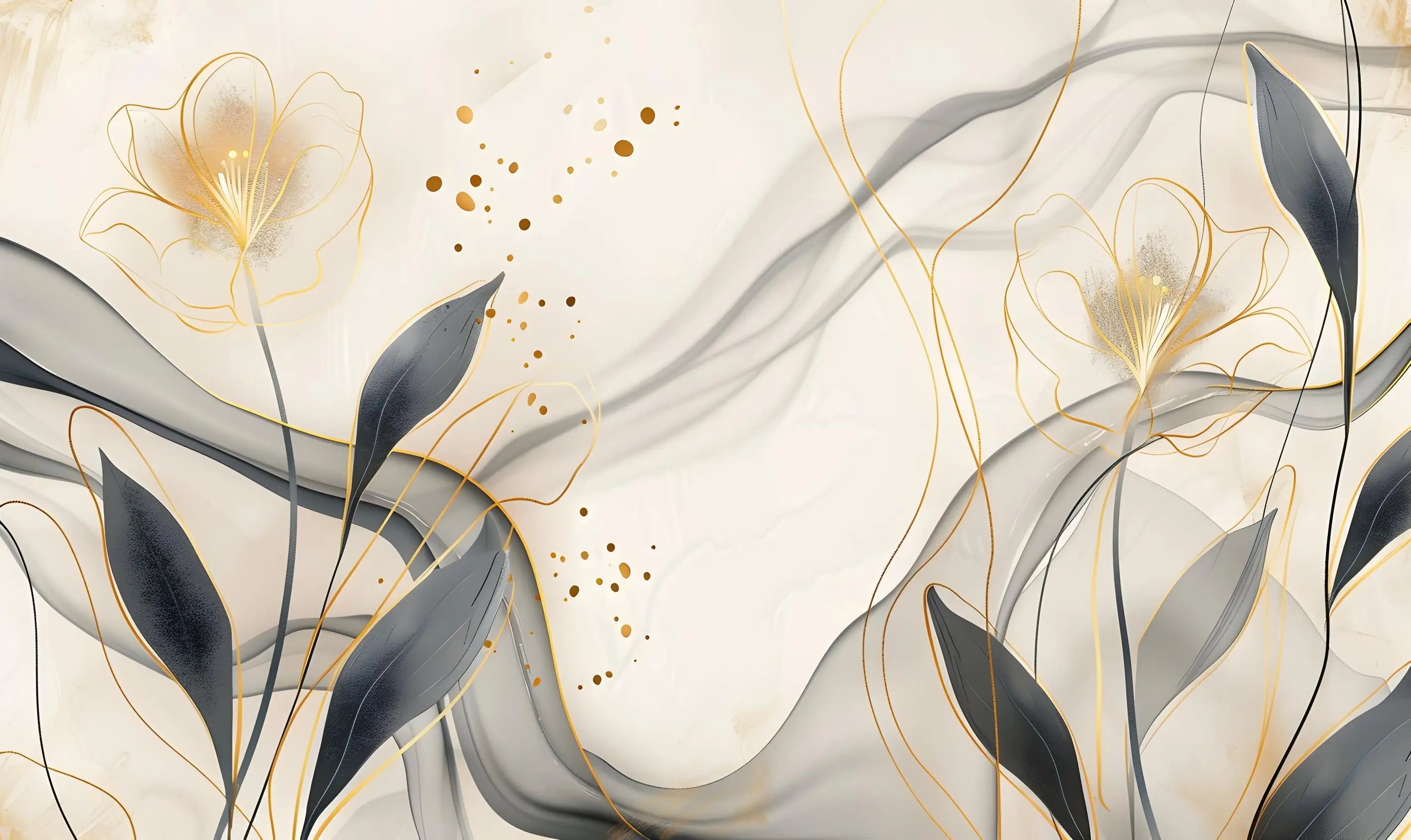 Papier Peint Floral – Fleurs Éthérées et Lignes Dorées