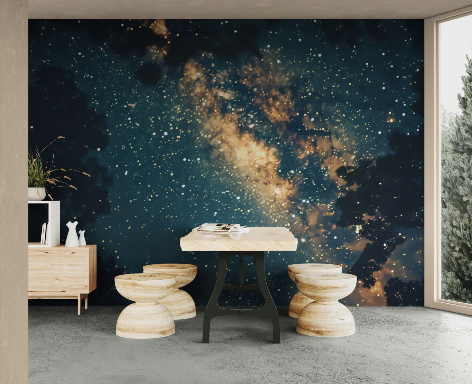 Un ciel étoilé profond s’illumine de nuances dorées subtiles. L’atmosphère cosmique instaure mystère et sophistication. Idéal pour une décoration immersive et élégante. Les contrastes renforcent la profondeur visuelle. Une invitation à l’évasion céleste.