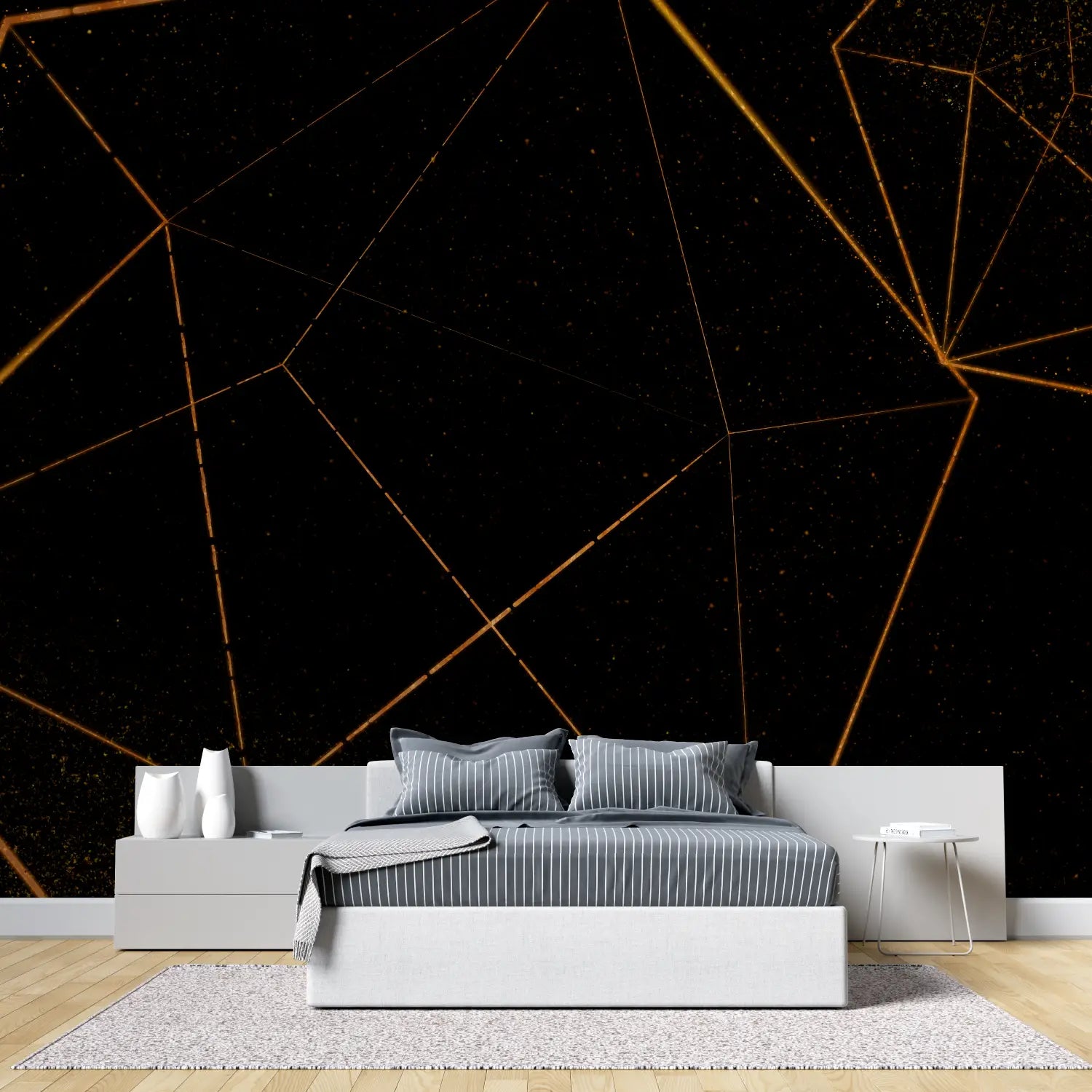 Offrez un impact visuel marqué avec des polygones dorés sur fond noir, structurant la paroi comme une grille précieuse. L’impression, nette, valorise l’éclat du métal et la sobriété nocturne du fond, soulignant le contraste chic. Un choix décoratif au caractère affirmé, qui fait rayonner la pièce d’une aura résolument contemporaine.