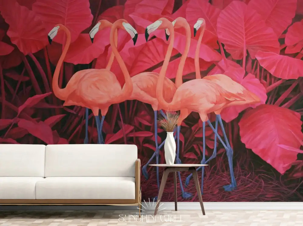 Conjuguez l’exotisme des plantes tropicales rouges à la grâce des flamants roses, pour un tableau luxuriant et pétillant. L’illustration, colorée, met en avant la silhouette élancée des oiseaux parmi un feuillage flamboyant. Un décor festif et dépaysant, parfait pour impulser un souffle festif dans la pièce.