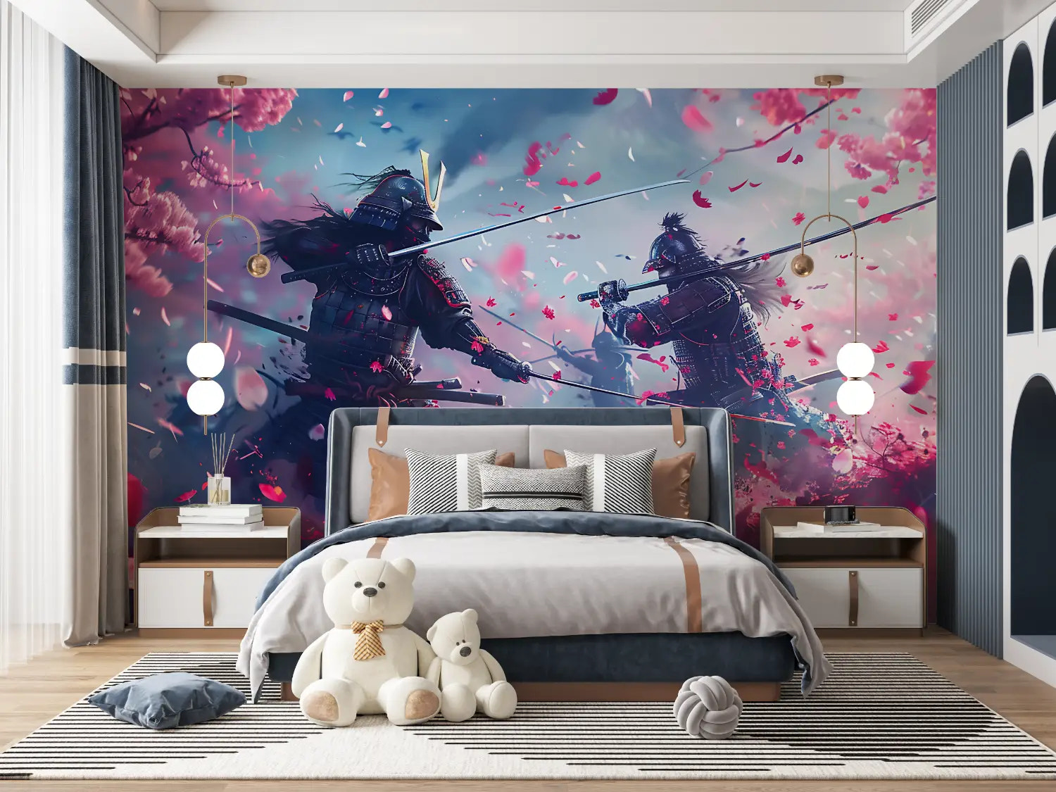Rendez la scène d’un duel de samouraïs sous les cerisiers, mêlant la tension du combat et la pluie de pétales roses. L’illustration, vive, allie violence contenue et douceur florale, créant un contraste poignant. Un tableau narratif qui transporte dans une époque révolue, susurrant l’éclat et la fragilité de la vie.