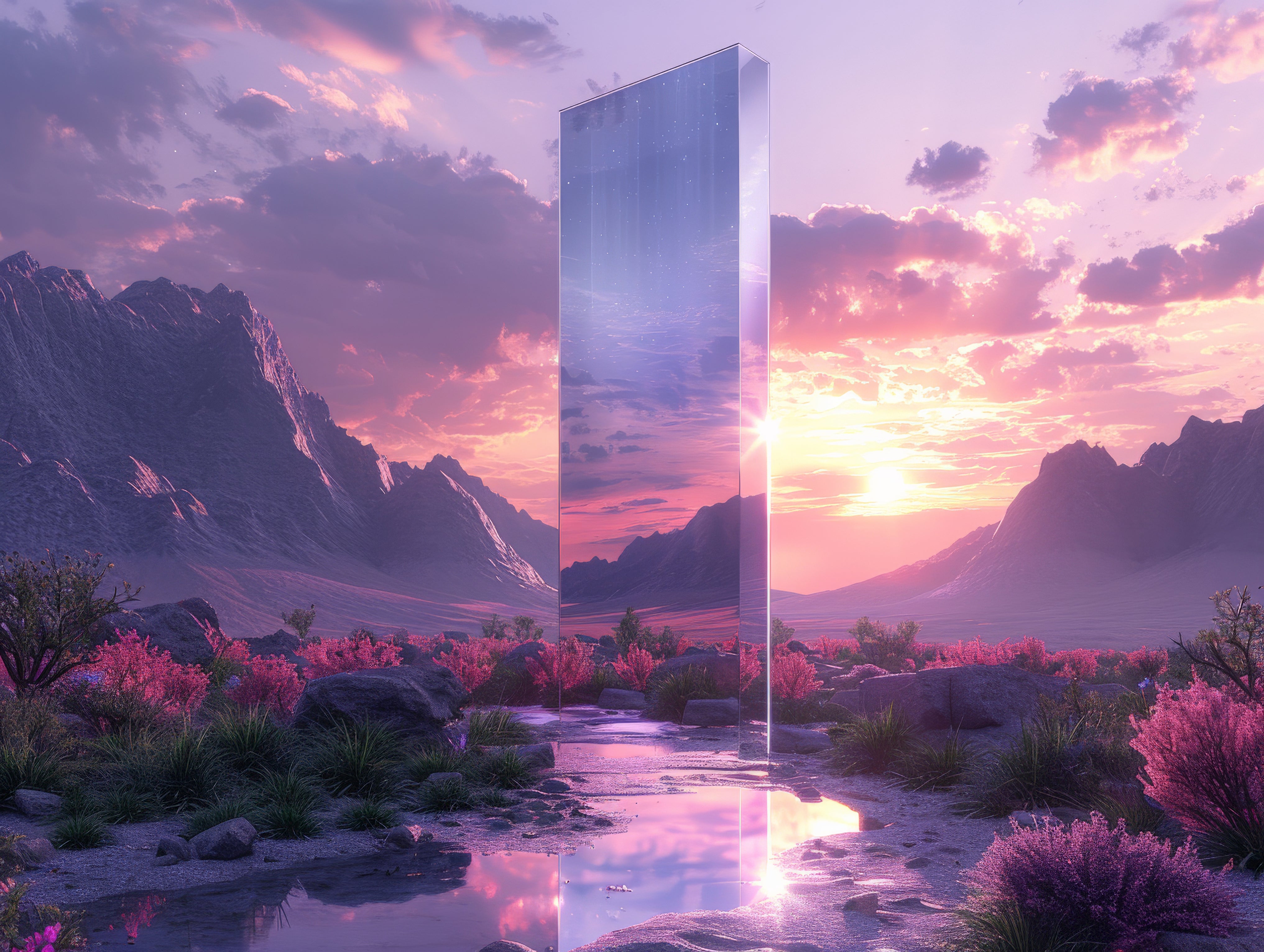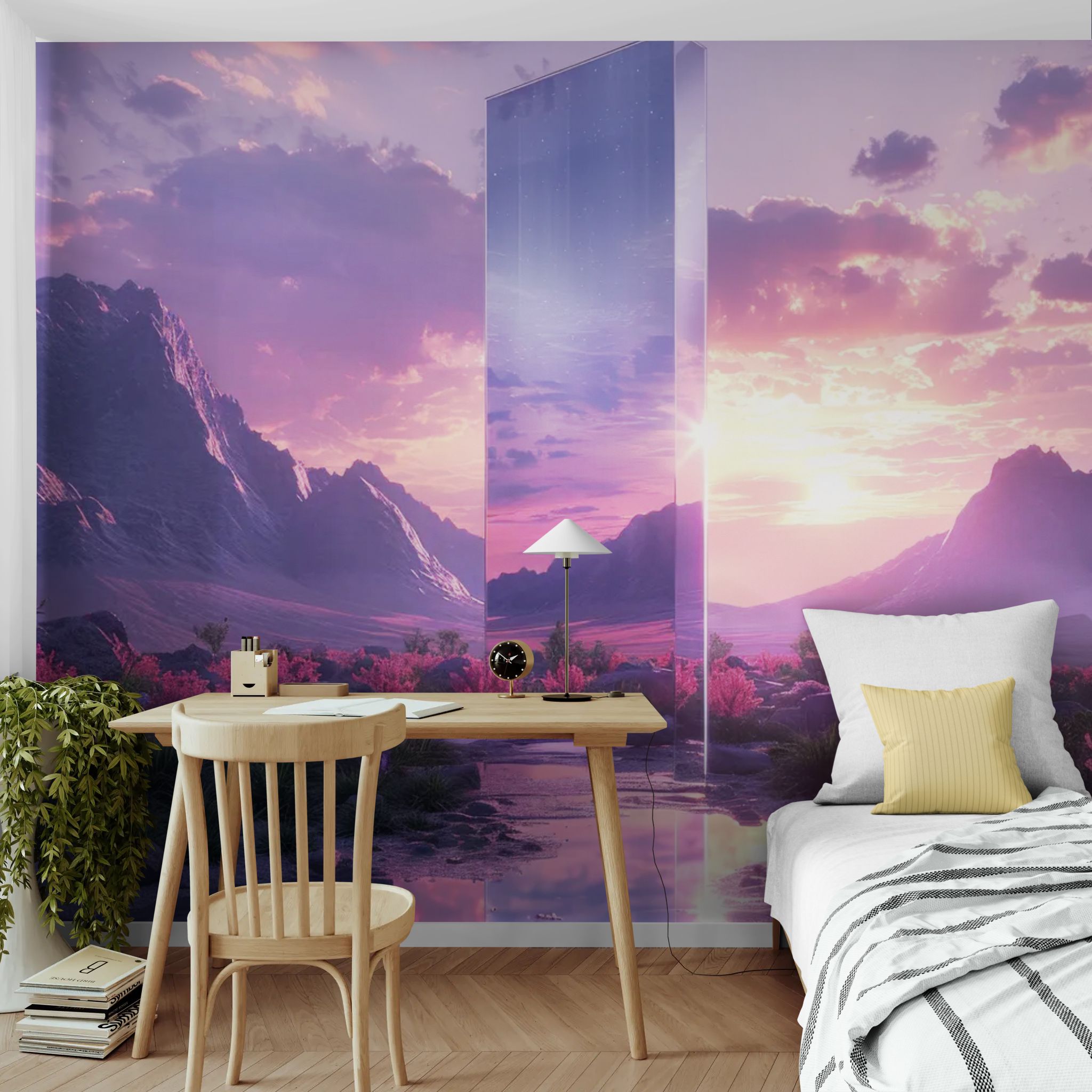 Un monolithe colossal traverse les nuages et reflète la lumière d’un soleil sacré, tel un artefact venu d’ailleurs. Parfait pour un intérieur contemplatif, une salle de méditation ou un salon design à l’ambiance mystique. Un décor imposant, énigmatique et profondément inspirant.