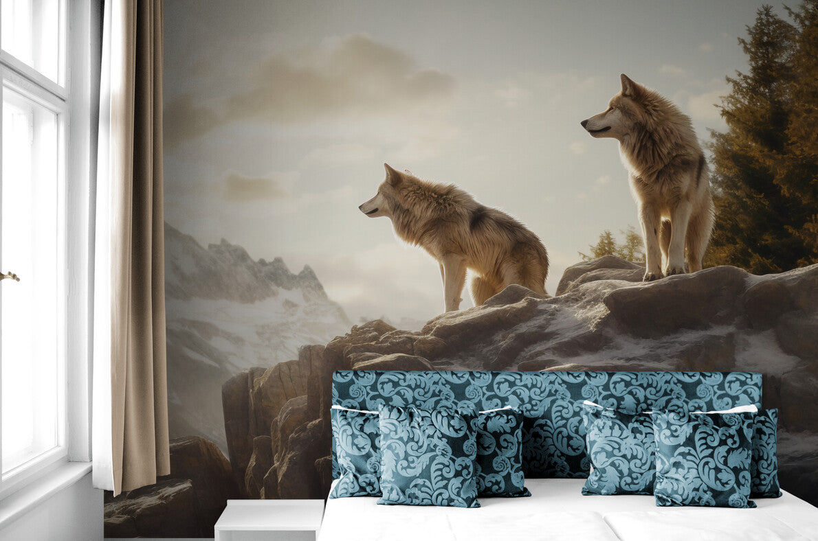 Ajoutez une touche sauvage et poétique à vos murs avec ce papier peint représentant des loups admirant les montagnes. Son design captivant et mystérieux offre une ambiance unique et raffinée, parfaite pour un intérieur distingué.