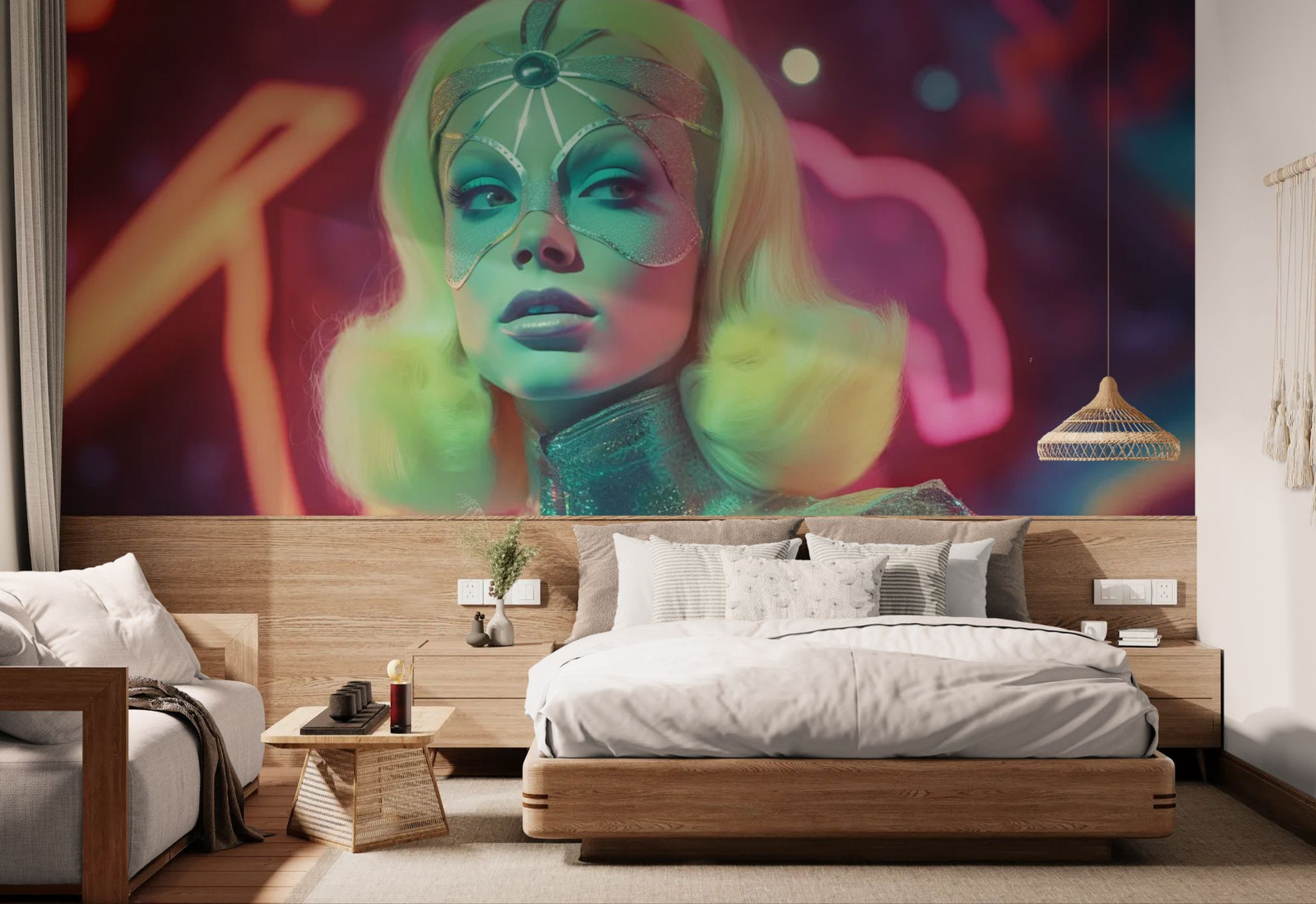 Une souveraine cosmique baignée d’éclats néon règne sur un empire interstellaire. Ambiance rétro-futuriste puissante, parfaite pour un décor synthwave ou un salon au style galactique premium.