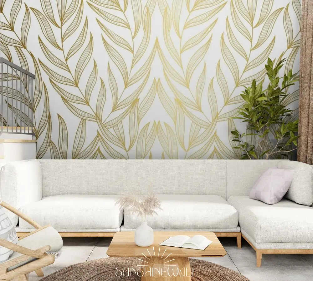 Sublimez votre espace avec ce papier peint panoramique mettant en valeur un feuillage doré finement dessiné. La touche d’or associée au fond sobre apporte luxe et sophistication à votre décoration intérieure, idéale pour un salon ou une chambre raffinée.