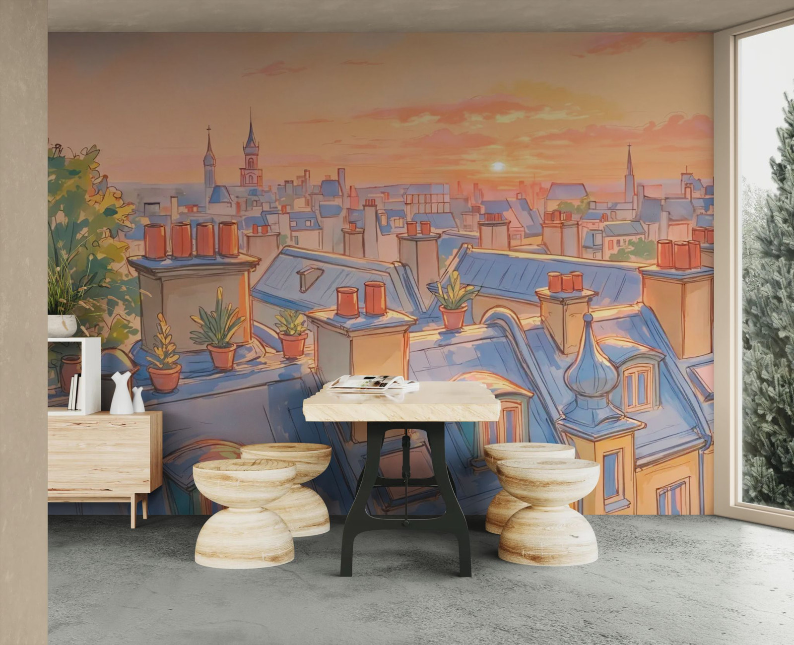 Romantisme parisien à l'heure dorée. Sublimez votre intérieur avec ce papier peint Paris. La vue panoramique sur les célèbres toits en zinc et les cheminées, baignés par la lumière chaude du coucher de soleil, offre une poésie urbaine inégalée. Ce décor emblématique apporte charme et élégance à un salon ou une chambre romantique.