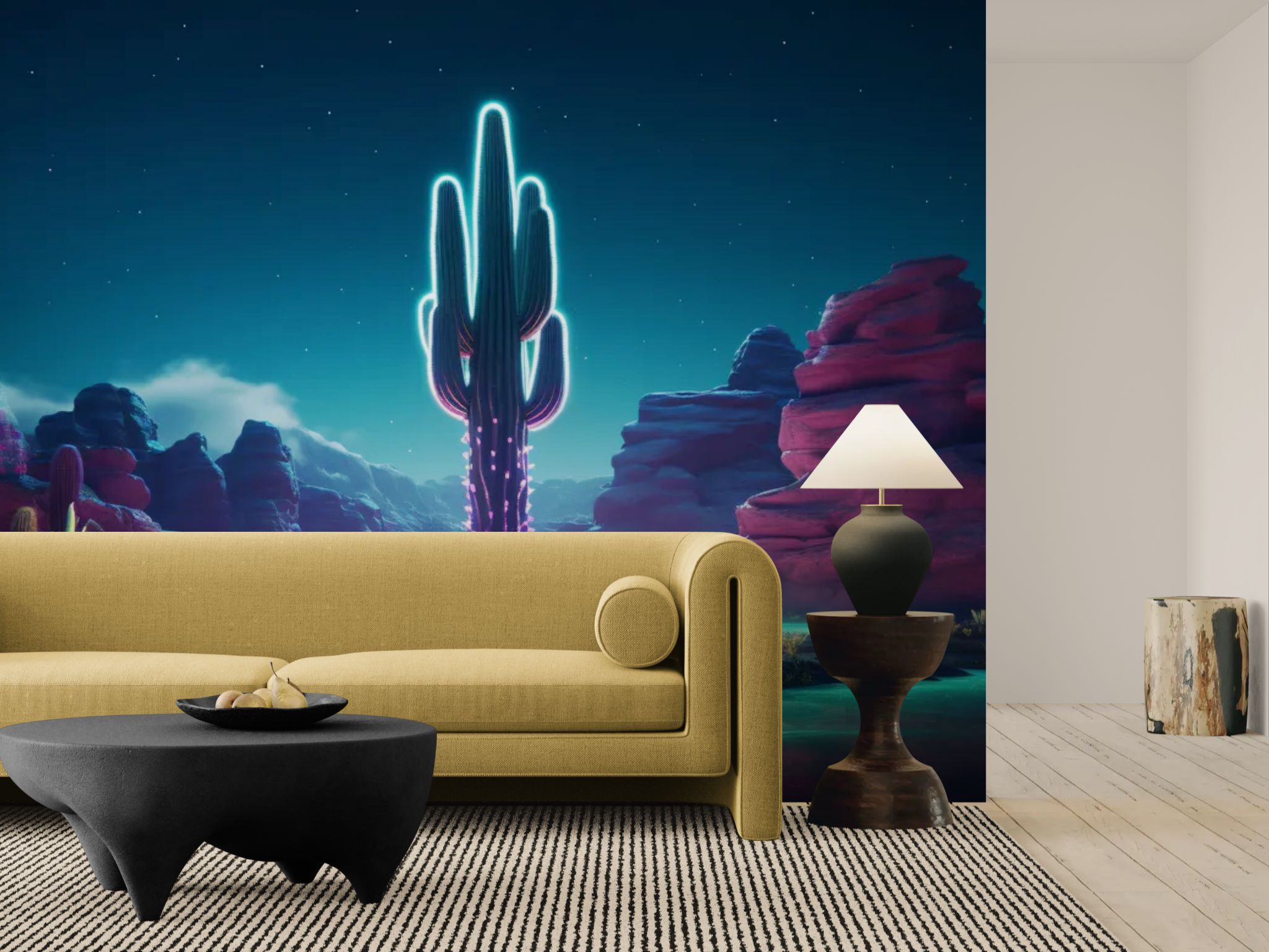 Un désert nocturne sublimé par des cactus aux lueurs néon futuristes. Ce décor premium fusionne nature sauvage et esthétique cyber, pour un intérieur audacieux et ultra-moderne. Parfait pour un bureau créatif, une salle de jeu ou un salon design.