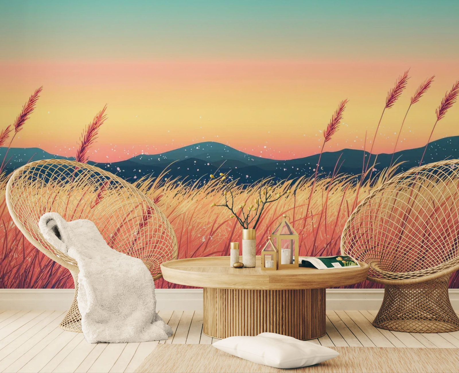 La danse de la nature sous le soleil. Faites entrer la lumière et le mouvement avec ce papier peint paysage. Le champ doré (blé ou herbes hautes) ondulant au vent sous une lumière rasante capture l'instant magique de l'heure dorée. Ce décor rustique chic apporte une texture naturelle et une sensation de chaleur immédiate. Idéal pour une cuisine de campagne ou une chambre lumineuse.