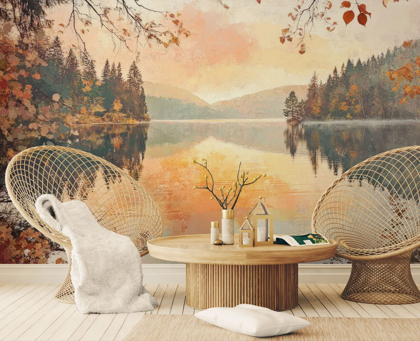 La mélancolie flamboyante de la saison. Réchauffez votre décoration avec ce papier peint paysage. Le lac paisible reflétant les arbres aux couleurs de l'automne (rouge, orange, or) crée une atmosphère chaleureuse et nostalgique. Ce tableau naturel apporte une touche de couleur organique et une profondeur apaisante. Parfait pour un salon cosy au coin du feu.