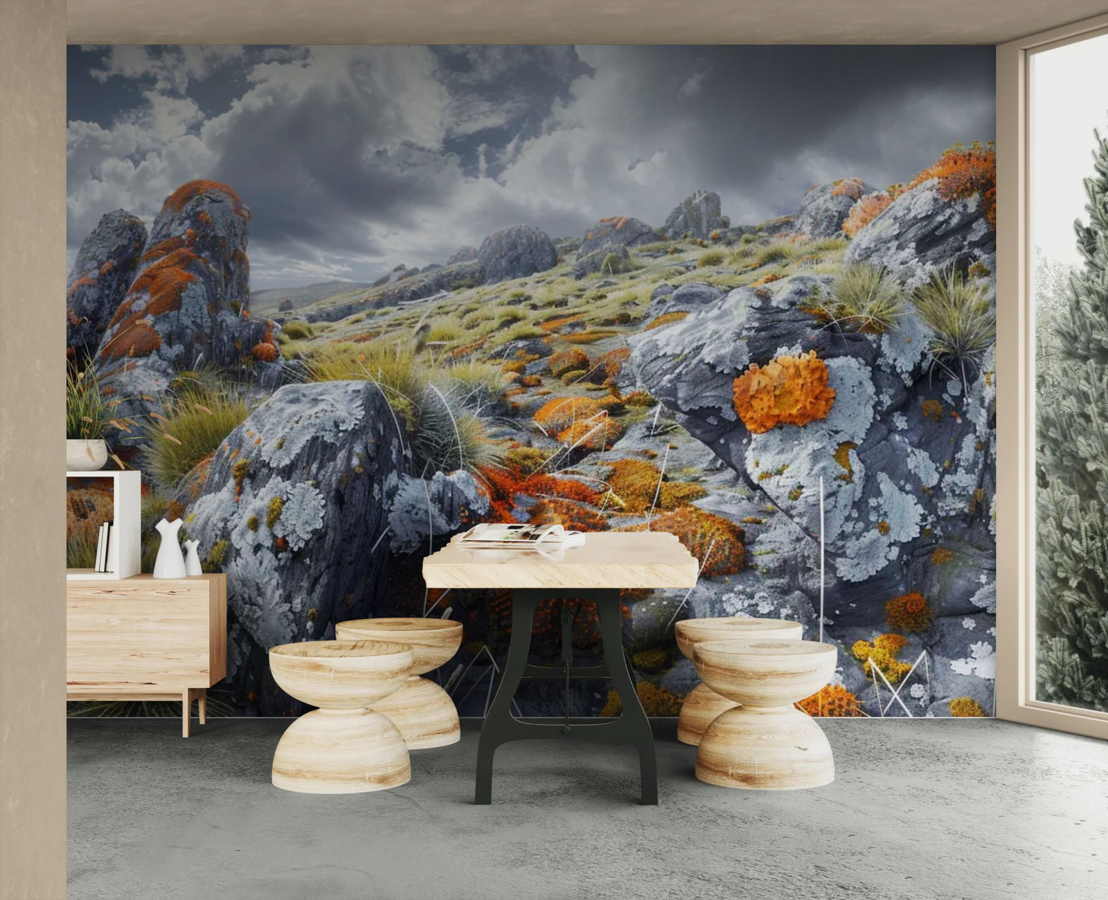 Des rochers sauvages ponctués de lichens dorés composent un décor puissant et naturel. Les textures minérales apportent profondeur et caractère. Idéal pour créer une ambiance authentique et élégante. La palette subtile capte la lumière avec finesse. Une immersion brute et raffinée.